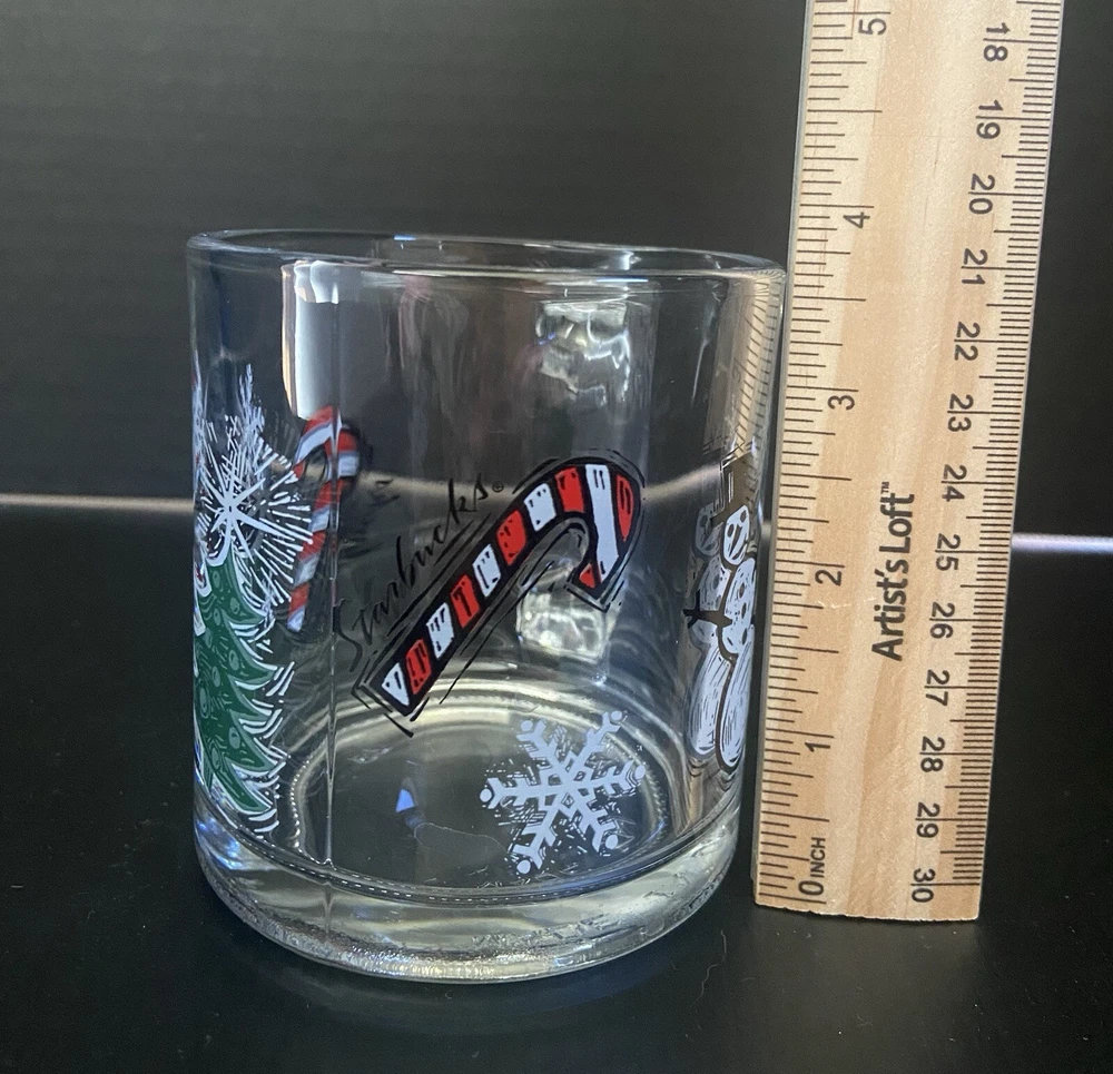 This vintage Starbucks clear glass coffee mug features an embossed snowman design, perfect for the Christmas season. With a 10 oz capacity, this medium-sized cup is ideal for hot or cold beverages and is made of normal glass. The mug is decorated with an all-over candy cane pattern and is a great addition to any collection. This Starbucks Clear Glass Christmas Mug Vintage Snowman is a must-have for any collector or fan of vintage items. It is an original, licensed reproduction from 1994 and is perfect for unisex adults and teens. The mug is easy to clean, but it is recommended to hand wash only. Add a touch of retro style to your kitchen with this unique and magical piece.