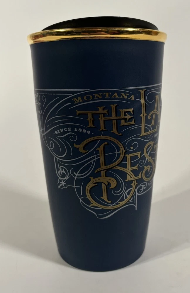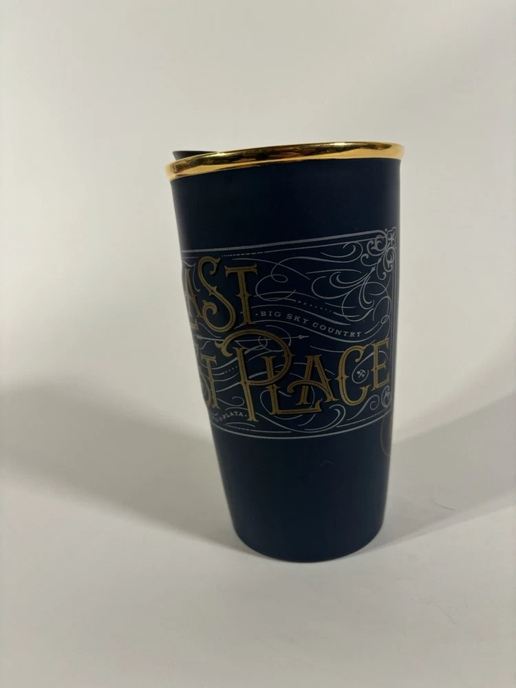 Enjoy your favorite Starbucks beverage on-the-go with this ceramic travel mug. Featuring a beautiful blue color and decorated with the Montana Last Best Place design, this 10 fl oz. cup is perfect for all occasions. The double-walled, insulated design keeps your drink hot and the lid helps to prevent spills. Made by Starbucks, a trusted brand in the food and drink industry, this travel mug is suitable for hot beverages and is a great addition to any collection. Whether you're commuting to work or exploring the great outdoors, this mug is the perfect way to enjoy your favorite drink. SKU3