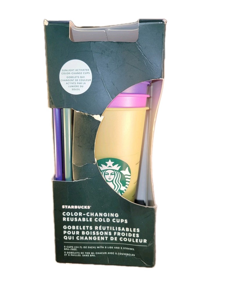 THESE ARE NEW. BOX INCLUDED. BOX HAS SOME DAMAGE. 2 CUPS WERE MISSING SO THERE ARE ONLY 3. The Starbucks Reusable Color Changing Cold Cups are a unique set of 3 pieces that are branded by the popular coffee chain. These cups can change color when filled with cold beverages, adding an exciting element to the drinking experience. With a colorful multi-color design and a theme focused on coffee & tea, these cups are a fun and eye-catching collectible item for Starbucks fans. Made in China in 2022, these cups are an original advertising piece for the brand. Perfect for both collectors and coffee enthusiasts, these cups are a must-have addition to any Starbucks memorabilia collection.