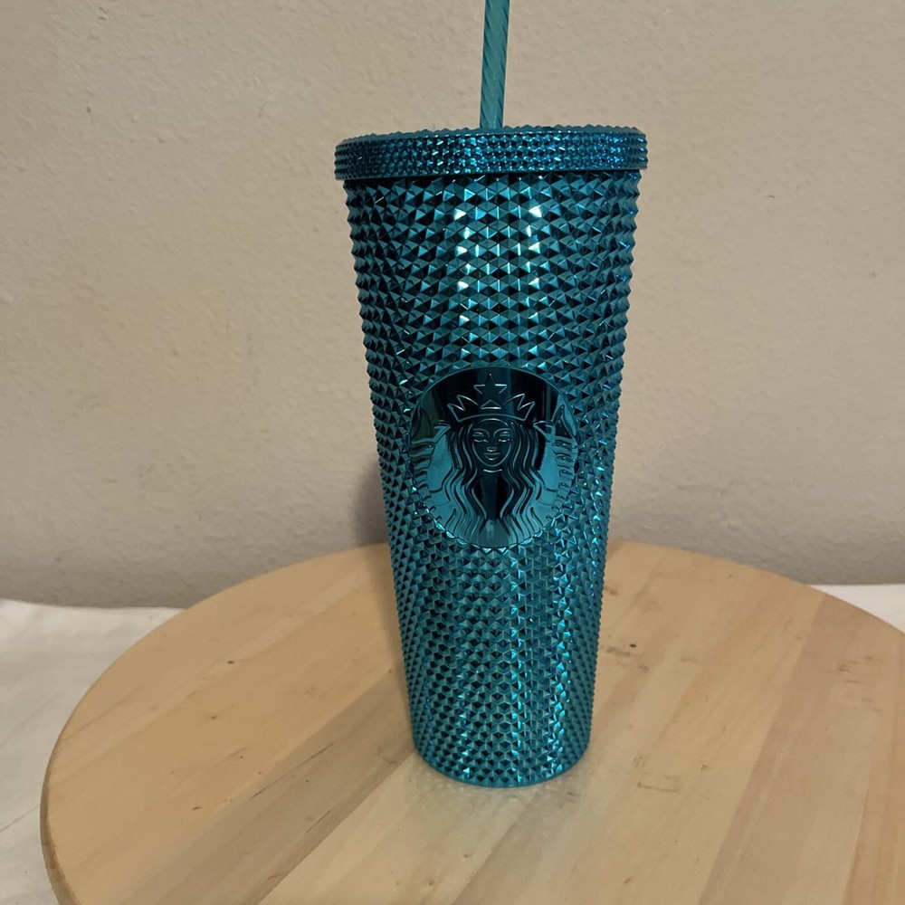 The product is a Starbucks Summer 2023 Metallic Chrome Teal Blue Bling Studded 24 oz Tumbler. It features a shiny metallic chrome teal blue design adorned with decorative studs for a stylish and eye-catching appearance. The tumbler is genuine Starbucks merchandise, brand new with the original price tag attached, confirming its authenticity as a Starbucks product. This collectible item is a unique piece from Starbucks, perfect for coffee and tea enthusiasts looking for a trendy and high-quality tumbler for their beverages.