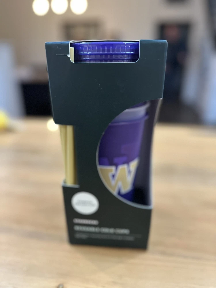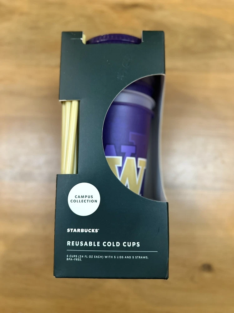 Show your love for the University of Washington Huskies with these Starbucks cold cups! These 24 oz cups come in a pack of 5 and feature the iconic purple color and logo of the Huskies. Perfect for coffee or tea lovers, these cups are made of recyclable material and are original Starbucks merchandise. These cups are perfect for collectors and fans alike, and are a great addition to any Starbucks or college-themed collection. Made in China, these cups are brand new in their original packaging and include straws. Get your hands on these Starbucks University of Washington Huskies cold cups today!