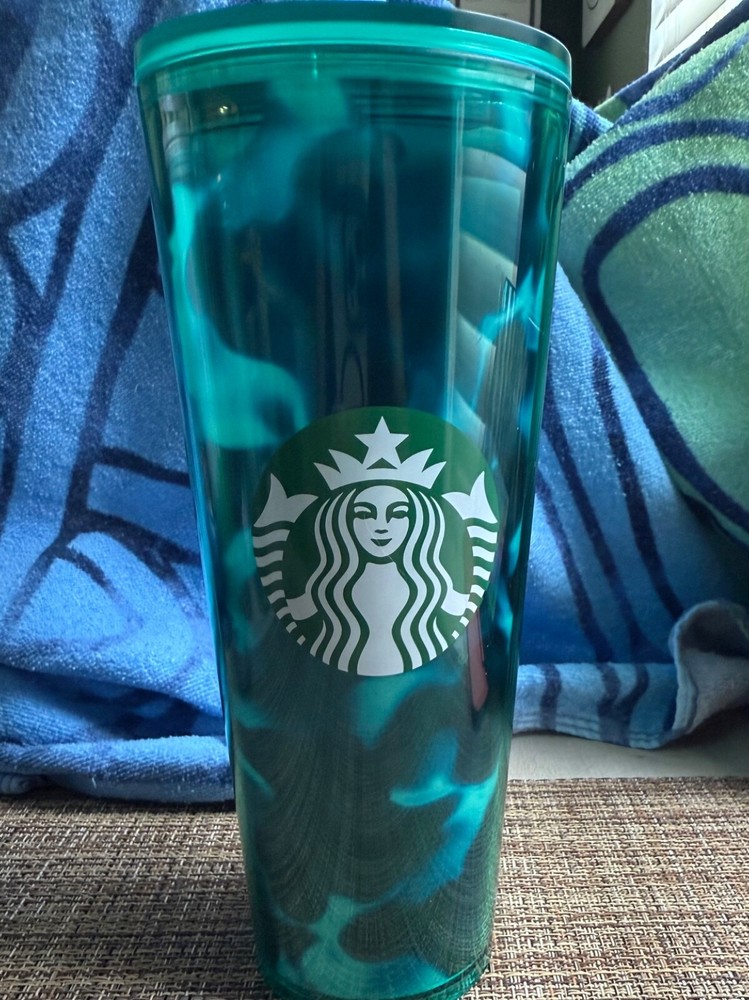 Used cold Starbucks tumbler. Used only a couple of times. Sat in my cabinet mostly. Normal wear and tear on from sitting on multiple surfaces.