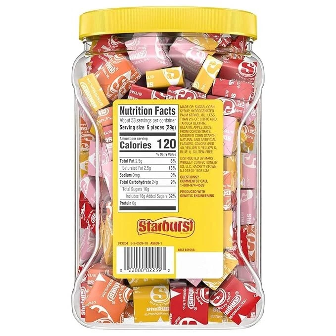 Stock up on everyone's favorite unexplainably juicy chewy candy. This bulk candy jar of Starburst Fruit Chews Candy is perfect for stocking the pantry at home or at work. Each fruit chew is packed with a juicy burst of fruit flavor. Have a friend that swears pink Starburst are the best? A coworker who only eats red Starburst fruit chews? A family full of orange Starburst fans? We know you know someone who enjoys the zest of yellow Starburst candy. Please them all with this Starburst candy bulk assortment mix, featuring plenty of their favorite flavors. Each jar contains the perfect mix of strawberry, cherry, orange, and lemon flavors. Make sure to pick up enough Starburst candy for party bags or to use as pinata candy. No celebration is complete without a candy buffet full of fruity chewy candy. Fill your favorite candy dishes with bulk individually wrapped Starburst candy. You'll love always having a chewy candy treat on hand with a burst of unexplainably juicy flavor. Starburst fruit chews are a gluten-free candy making them a perfect candy to share with everyone. Pass them around to Trick-or-Treaters, no Halloween candy assortment is complete without Starburst chewy candy. With bulk Starburst Original Fruit Chews Candy, there are endless ways to add a burst of unexplainably juicy flavor to all of life's candy-filled moments. Product Features: Bulk Jar Features your favorite Starburst Flavors, including strawberry, cherry, orange and lemon Perfect for candy buffets, piñatas and parties Stock the office pantry with a bulk candy jar of Starburst Fruit Chews Gluten-free, fruit-flavored candy chews with a soft, chewy texture Includes one 54 oz. jar of Starburst Original Fruit Chews Candy Ingredients: Sugar, Corn Syrup, Hydrogenated Palm Kernel Oil; Less than 2% of: Citric Acid, Tapioca Dextrin, Gelatin, Apple Juice from Concentrate, Modified Corn Starch, Natural and Artificial Flavors, Colors (Red 40, Yellow 5, Yellow 6, Blue 1)