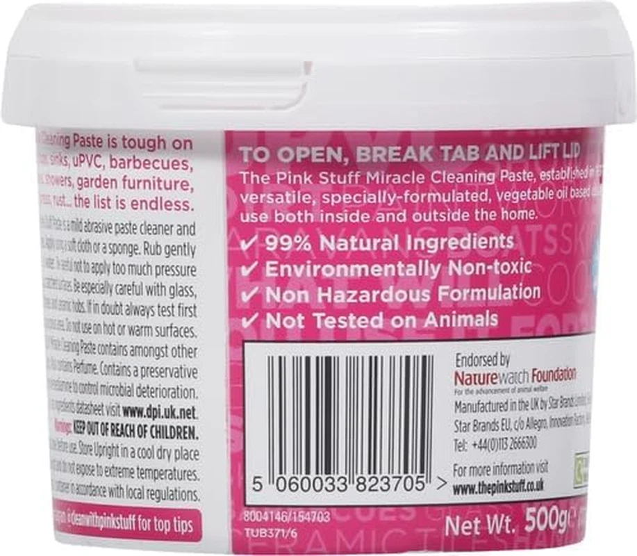 Miracle Cleaning Paste: Tackle tough stains and grime effortlessly with The Pink Stuff, the ultimate multi-purpose cleaning solution that delivers sparkling results on various surfaces. Versatile & Effective: Perfect for use on kitchen and bathroom surfaces, tiles, glass, stainless steel, and more. This versatile paste is your go-to cleaner for almost any household mess. Gentle Yet Powerful: Tough on dirt but gentle on surfaces, this cleaning paste removes stubborn stains without scratching or damaging, leaving surfaces spotless and shiny. Easy to Use: Simply apply a small amount of paste to a damp cloth or sponge, rub gently, and rinse away for a clean and polished finish. Ideal for everyday cleaning tasks. Pleasant Rhubarb Fragrance: Enjoy a fresh, clean scent after every use. The Pink Stuff leaves your home not only spotless but also smelling great with its delightful rhubarb fragrance The Cleaning Paste That Works Like Magic! Tired of stubborn stains and grime that just won’t budge? The Pink Stuff is here to save the day! Our Miracle Cleaning Paste is a powerful, multi-purpose cleaner designed to tackle the toughest jobs while being gentle on surfaces. Whether it’s your kitchen, bathroom, or outdoor equipment, The Pink Stuff is the all-in-one solution you’ve been looking for! Versatile & Effective: Perfect for removing grease, rust, and even burnt-on food from cookware and appliances. Use it on tiles, metal, glass, and more! Gentle on Surfaces: Tough on stains but kind to your home, this paste cleans without damaging your surfaces. Effortlessly Removes Stains: Whether it's limescale, rust, or everyday dirt, The Pink Stuff makes cleaning easier. Easy to Use: Simply apply the paste to the affected area with a sponge or cloth, scrub, and rinse. Your surfaces will look brand new in no time! Say goodbye to elbow grease and hello to effortless cleaning with The Pink Stuff – the miracle worker your home deserves!