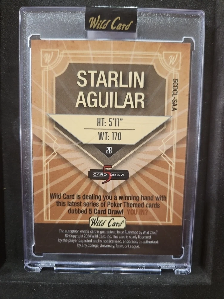 The trading card features Starlin Aguilar, a baseball player, and is autographed. It is a unique one-of-one card from the 2024 Wild Card 5 Deck Draw baseball set by Wild Card. The card is from the Major League (MLB) and is in near mint or better condition. It is a valuable collectible for fans of baseball trading cards, especially those interested in rare and autographed items.