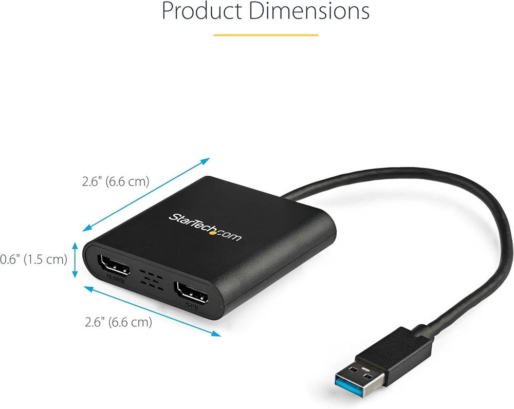Store New Arrivals Add to Favorite View Feedback Contact Startech.Com USB 3.0 to Dual HDMI Adapter, USB to 2X HDMI Monitor Converter Description Item model number USB32HD2 Item dimensions L x W x H 12.4 x 2.6 x 0.6 inches Color Black Product Dimensions 12.4 x 2.6 x 0.6 inches Country of Origin Taiwan Compatible Devices Windows 8/8.1, Windows 7, Windows 11, Windows 10 Connector Type HDMI, USB Type A Item Weight 1.97 ounces Department Audio, Video Adapters Manufacturer StarTech.com Is Discontinued By Manufacturer No Specific Uses For Product Personal and business productivity Size 2-port COMPATIBILITY WARNING: USB 3.0 to HDMI video adapter is only compatible with Windows and does not support macOS, ChromeOS, Linux or Windows ARM; You need administrator privileges to install the required drivers; Please read the instructions carefully INCREASE YOUR PRODUCTIVITY: USB to Dual HDMI monitor adapter lets you extend your desktop by adding up to two HDMI monitors to your laptop or desktop computer; Ideal for your workstation setup in the office or working from home 4K SUPPORT: Enjoy exceptional USB video performance with this USB to HDMI dongle; Video adapter support video resolutions up to 4K (3840x2160) at 30Hz PERFORMANCE: USB 5Gbps to Dual HDMI hub converter (1x USB-A male to 2x HDMI female connector) offer 1x 4K 30Hz (UHD) and 1x 1080p 60Hz Video, 2ch audio (through HDMI), HDCP 1.4 and 9.8in (25cm) cable length THE IT PRO'S CHOICE: Designed and built for IT Professionals, this USB 3.0 to HDMI video adapter is backed for 3-years, including free lifetime 24/5 multi-lingual technical assistance This USB 3.0 to Dual HDMI Adapter lets you add two independent HDMI displays to your computer using a single USB 3.0 port. One of the HDMI ports can output resolutions up to 4K, while the other can output resolutions up to 1920 x 1200. Adding more displays to your workstation can be difficult, especially if your computer does not support MST or offer many external video ports. This USB to dual HDMI adapter features two video outputs, boosting your productivity by giving you more screen space to work from. One of the ports on this USB video adapter supports resolutions up to 4K at 30Hz, enabling you to connect a 4K monitor to your computer, even if your laptop or desktop video card doesn’t natively support 4K output. The USB to HDMI 4K adapter lets you extend or mirror your primary display onto an Ultra HD monitor or television. Using the high-bandwidth USB 3.0 interface, this USB 3.0 to HDMI adapter enables smoother scrolling through documents, higher resolutions and better overall performance than earlier USB adapters. This USB 3.0 to Dual HDMI Adapter is backed by 3-year warranty and free lifetime technical support. ABOUT US We offer the best prices around on high quality products. Our E-store includes media such as books, movies, music and games while offering electronics, toys, sporting apparel, clothing, tools, general home, garden items and more. SHIPPING We are always working hard to ensure your package arrives as soon as possible. Please understand that some factors like weather, high postal traffic, and the performance of shipping companies are outside of our control. We offer free shipping to the lower 48 states and ship within 2 business days of payment, usually sooner. We do not accept P.O. Boxes. Please provide a physical address. RETURNS We offer a 30-Day Return Policy on items which you are not completely satisfied with. You have the option for a full-refund or an exchange of the item. No returns are available on items shipped outside of the USA. PAYMENT We accept PayPal. CONTACT US This page content is yet to come Please ad us to your favorite seller and visit again later Thank You CUSTOMER SATISFACTION We try our very best to make sure every customer is completely satisfied. If there's a problem, message us! We're happy to help.