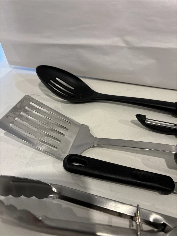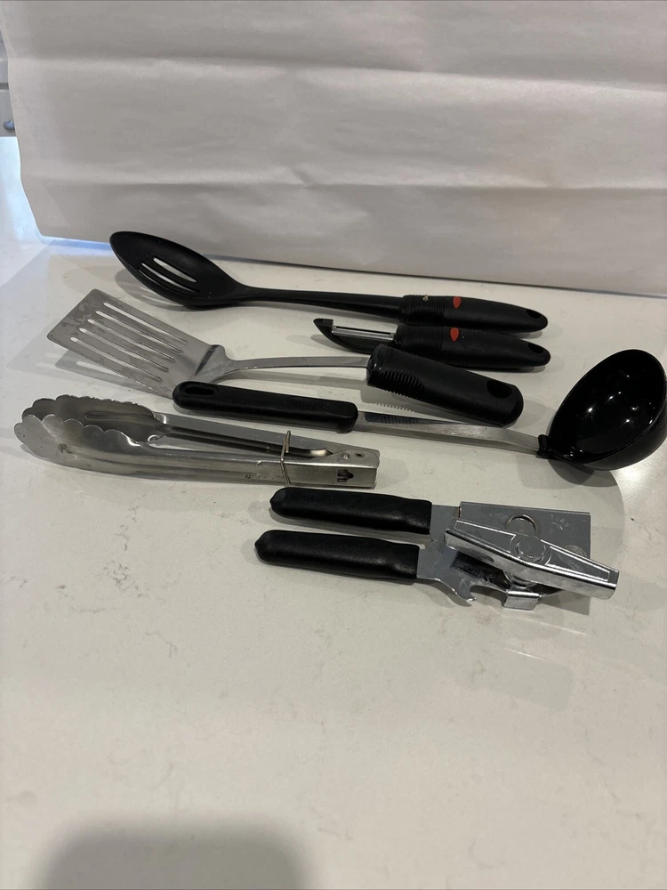 This starter kitchen utensil lot includes a variety of tools that will come in handy for any home cook. The set includes a ladle, cooking spoon, vegetable peeler, spatula, and tongs, all of which are made with durable rubber handles. These utensils are perfect for cooking and serving food, and they are sure to become staples in your kitchen. The set features tongs from Oxo, a trusted brand in the kitchen industry, as well as other useful tools like a ladle and a can opener. Whether you are a seasoned cook or just starting out, this set of kitchen utensils is a great addition to your collection.