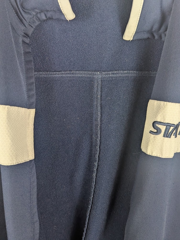 The Starter Men's Windbreaker Jacket in size XL is a practical and stylish choice for the winter and spring seasons. The navy blue jacket features a polyester outer shell with a warm fleece lining, making it perfect for casual occasions. With a zip closure, logo accents, and machine washable care instructions, this jacket combines comfort and practicality for everyday wear. Ideal for walking and other activities, this jacket from the reputable brand Starter is a reliable and fashionable addition to any man's wardrobe.