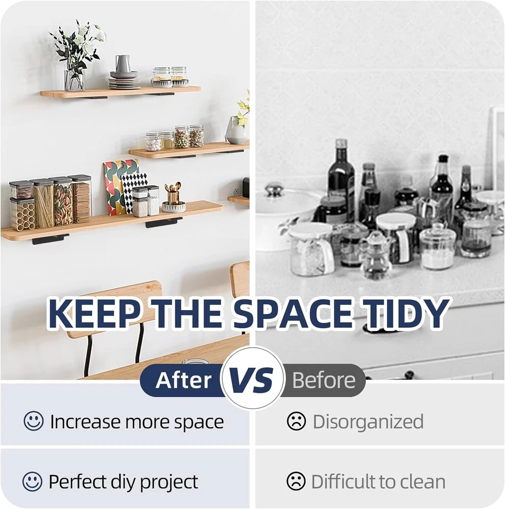 Starunder 6 Pack Floating Shelf Brackets 6 Inch Heavy Duty Industrial Shelf New Size:6 Inch Number of Items:6 Color: Black Material: Metal Item dimensions L x W x H: 6 x 4 x 2 inches Finish Type: Black Real Hidden Brackests: These black shelf brackets have no lips and can be truly hidden. The base can be blocked by the plank, creating an amazing floating illusion. Compared with other floating shelf brackets, this bracket is easier to install Heavy Duty: This kind of metal bracket is thicker and heavier, each one has a solid weight and density. Weight capacity of 150 lbs per pair. The surface of the frosted particles has a richer texture, has anti-scratch and anti-rust functions, and can be used for life. Hardware Included: The package includes 6 supports, 24 long screws, 12 short screws and 24 anchors. The countersunk screw hole guarantees that the nut stays flush with the bracket without being obtrusive. Perfect DIY Project: Improve item storage efficiency. Make the most of your family space. Including but not limited to kitchen, bathroom, bedroom, office, warehouse. You can even use it as a cat climbing wall support. Two Installation Methods: Our floating shelf brackets can be installed upwards or downwards, and it is certain that no matter which installation method is chosen, it can be easily done. Return Policy: We offer a 30 day return policy from the receiving date. Please contact us for a Free Return Label. Please use our return label so it will go back to our supplier and we can do a refund or replacement afterwards. Feedback: Your satisfaction is very important to us! If you have any problem with your order, please contact us and we will do our very best to make you satisfied. As long as you are happy with your purchase, please leave a positive feedback for us. We will always leave you a positive feedback in return. If you have any problem with your purchase, please do not leave a negative feedback. Please Contact us ... and your issue will be solved quickly and positively We are a small family-owned business trying to make a living, not a huge company that does not care ... We will ALWAYS do our best for you!
