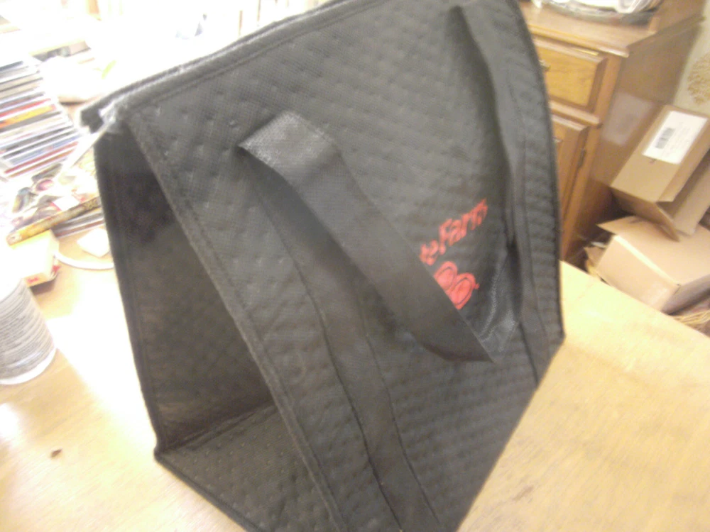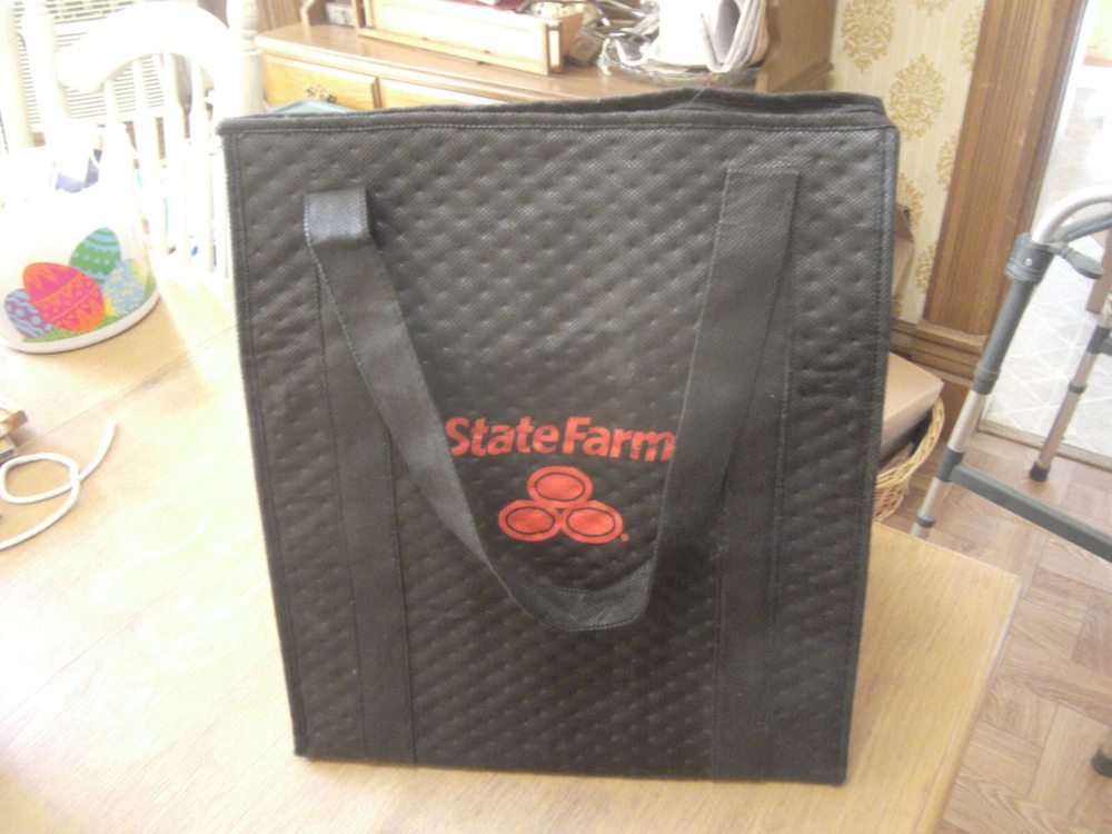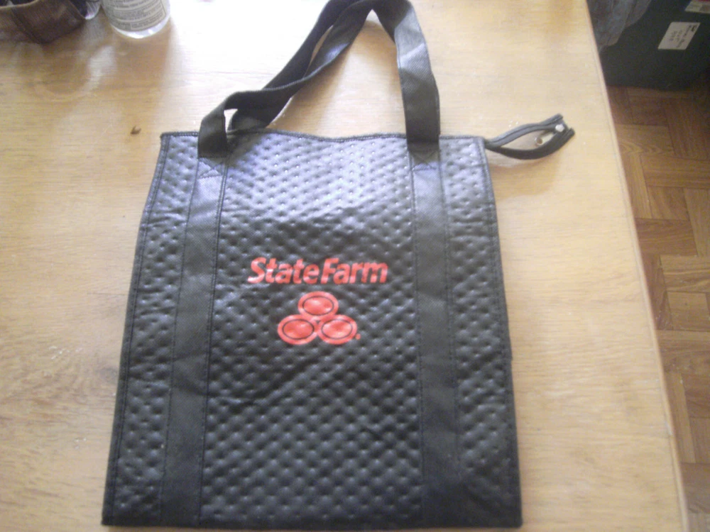Get your hands on this State Farm insulated zipper grocery tote bag from Bag Makers. This black tote is perfect for your everyday shopping needs. With a medium size and a height of 15 inches, this bag is spacious enough to hold all your groceries. Made of a durable combination of nylon, canvas, and plastic, this tote is designed to last. Featuring a zipper closure and a variety of features including, but not limited to, a 14-inch length, a 10-inch width, and the State Farm brand logo, this bag is both stylish and functional. Ideal for all your household needs, this tote is a must-have and will make your shopping experience a breeze.