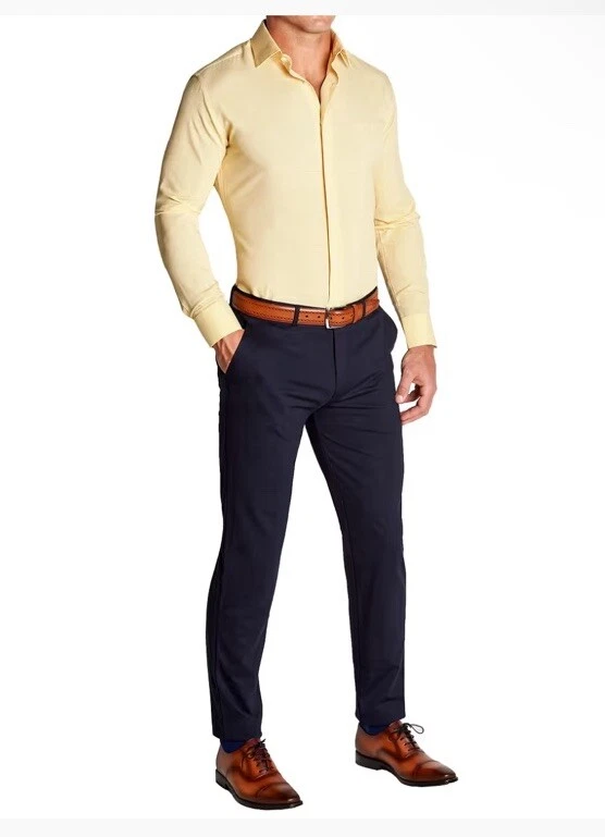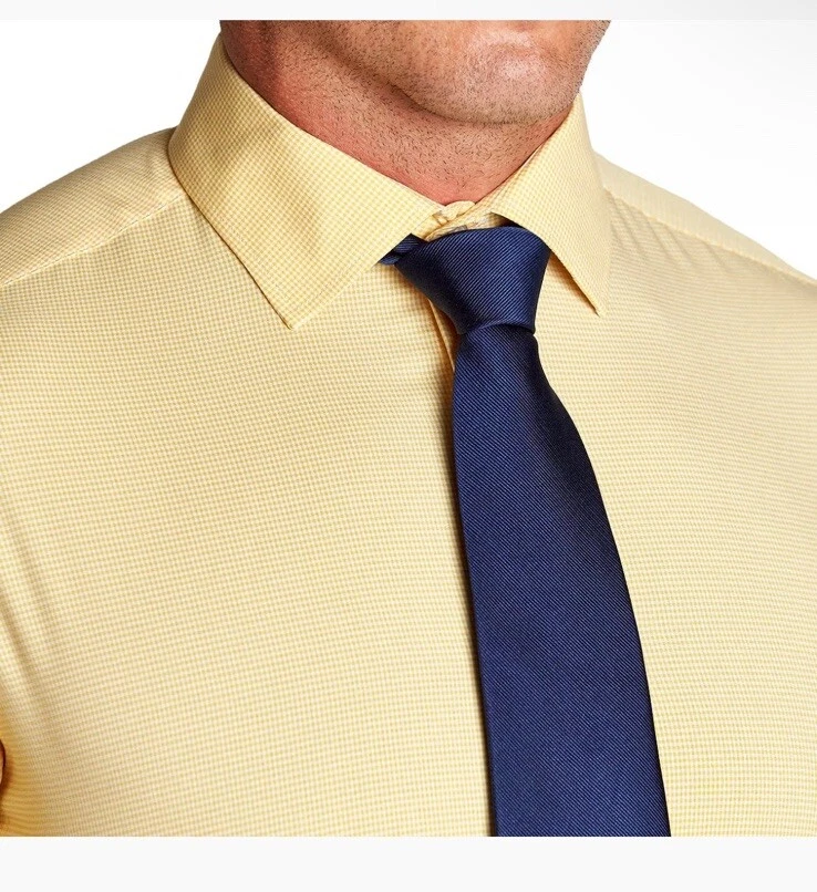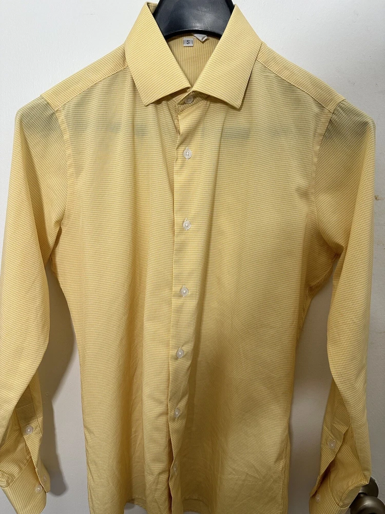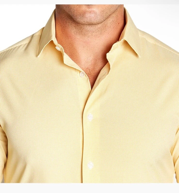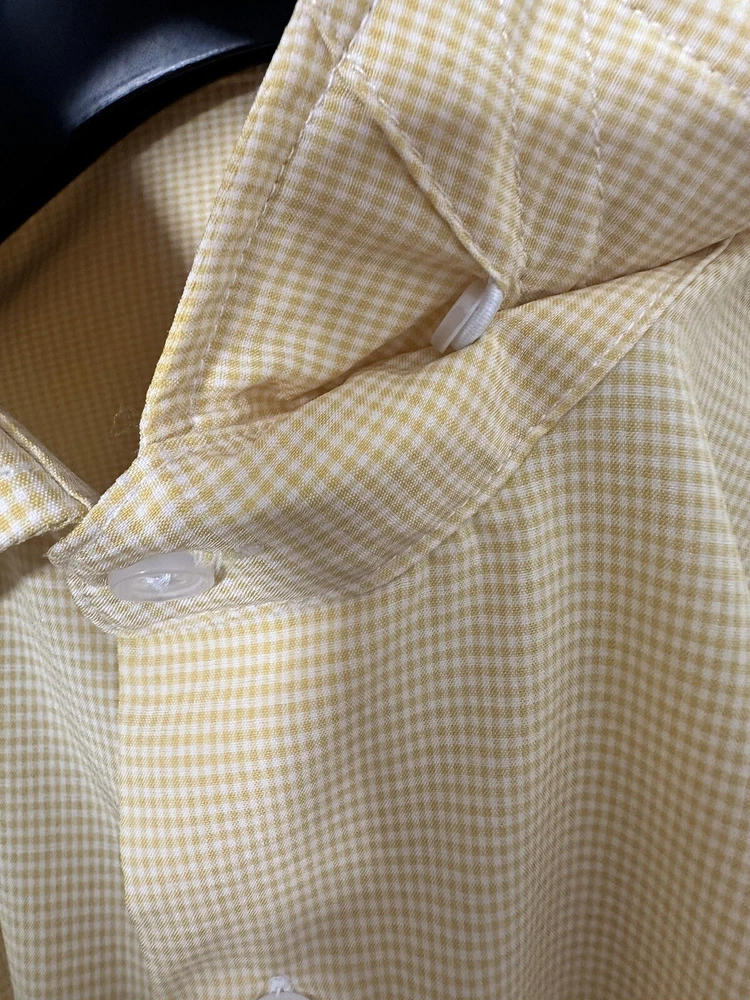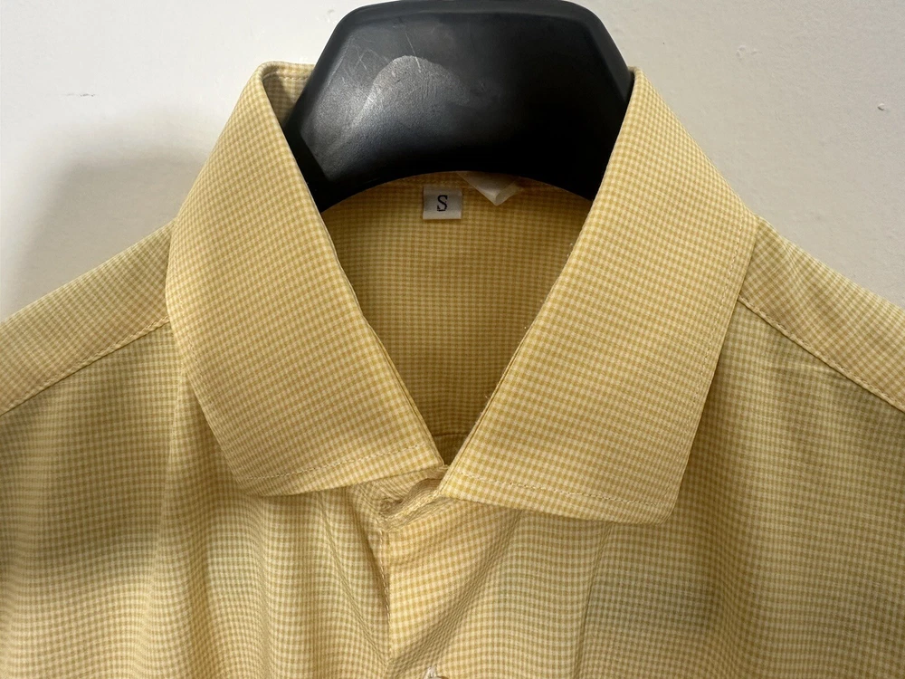 This State & Liberty dress shirt in size S features a yellow microcheck pattern with a collared neckline and long sleeves. It is made for athletic fit and is perfect for men who want to look smart and stylish. The shirt is branded with State & Liberty and falls under the category of clothing, shoes, and accessories. The shirt is ideal for men who love to wear dress shirts and want to add a stylish piece to their wardrobe. The shirt has a theme of State and is perfect for any occasion.