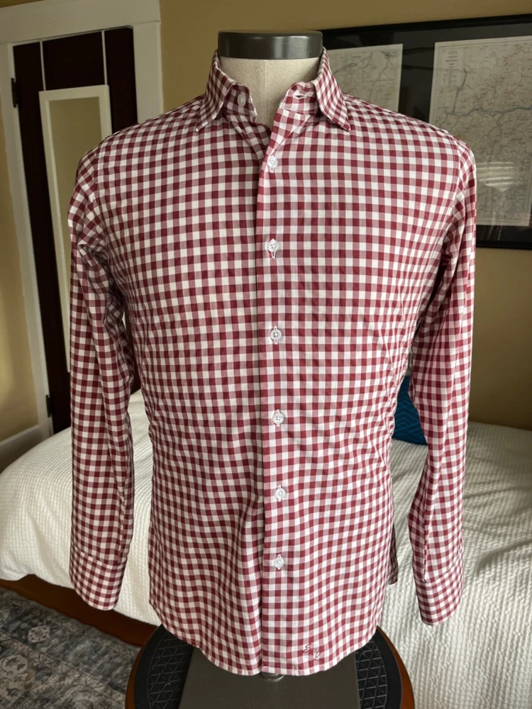 State & Liberty Sz. S Fitted Red Gingham Check L/S Shirt Hidden-Button Collar. Well cared for and in excellent condition. This is labeled a size small and has a fitted profile. Please use the MEASUREMENTS IN PHOTOS and compare to a similar piece you own. If there's another measurement you'd like, let me know. Ask all questions before offer, bid or purchase and consider pictures as part of description. I will list any issues I find. Returns: I do my best to completely inspect all the items I list so that I can note any defects. If you find a defect that I failed to note or if it just doesn't work for you, please send back the item for a refund. There is no cost to the buyer for domestic returns. Thanks for looking! I will ship this as soon as possible after payment clears!