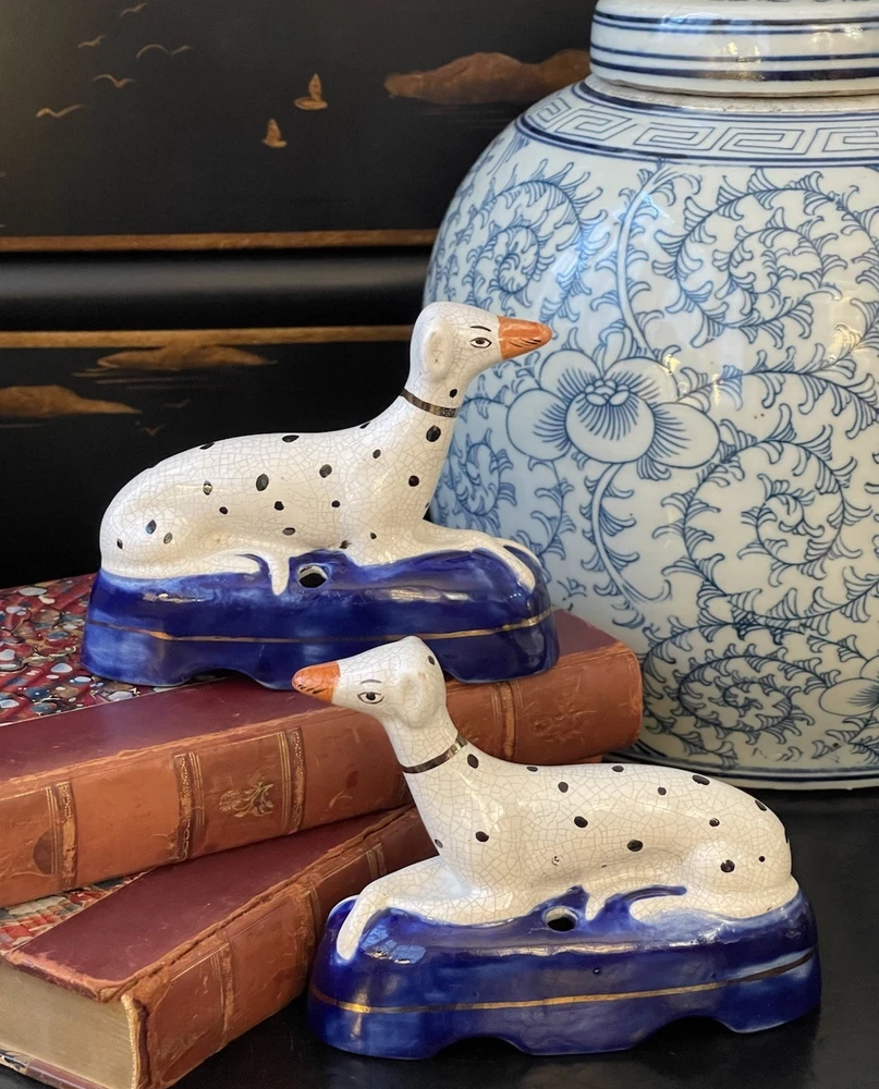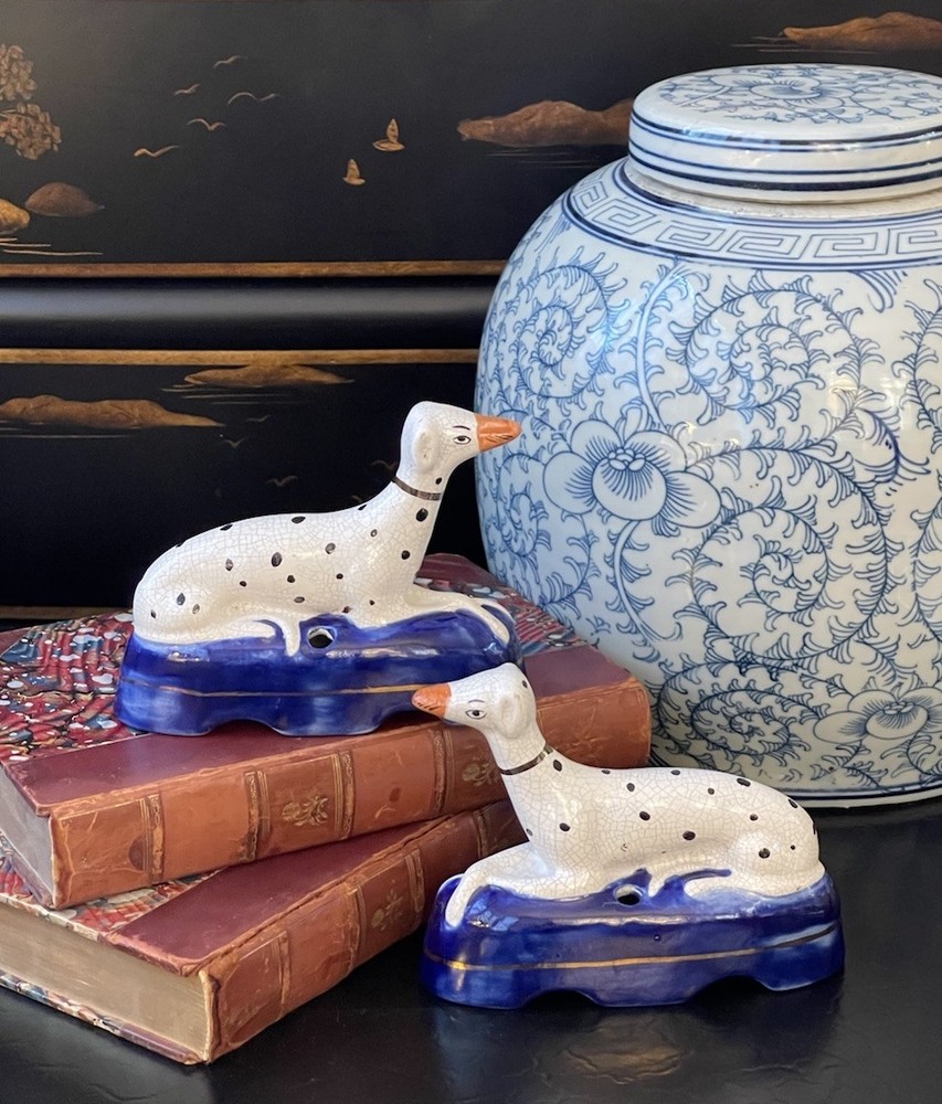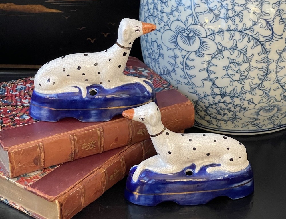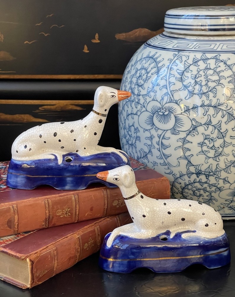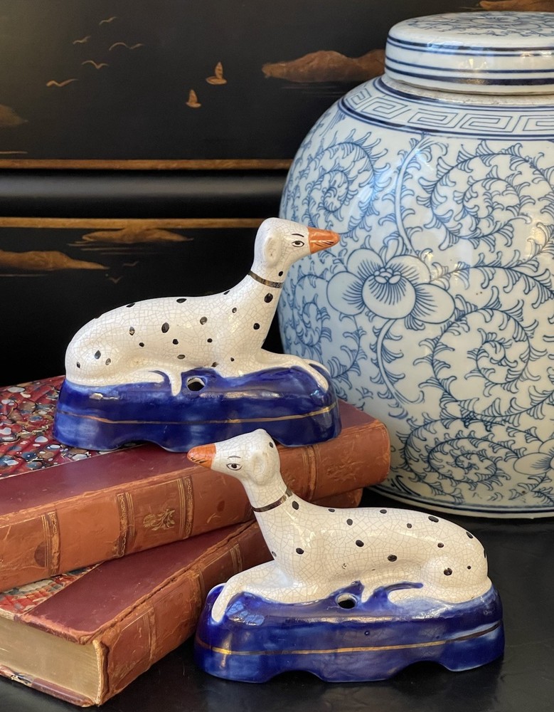 Timeless 19C Antique Original English Porcelain Staffordshire Dalmatian Mantle Dog Ink Well Pair • Height 4” • Length 5.25” • Width 2” This rare gallery quality pair of original 19C antique petite English Staffordshire porcelain dalmatian mantle table dogs is hand painted with spotted coats, burnished gilt collar and cobalt bases on which each figure is seated in semi-recumbent formal pose. Highly desirable and scarce with tan snouts, these elegant period examples will bring a touch of the English countryside to any setting in which they are placed whether paired on their own as a focal point or grouped as part of a collection or arrangement. Condition excellent. Rarely found intact surviving models. Minimal expected age related wear. Display ready.
