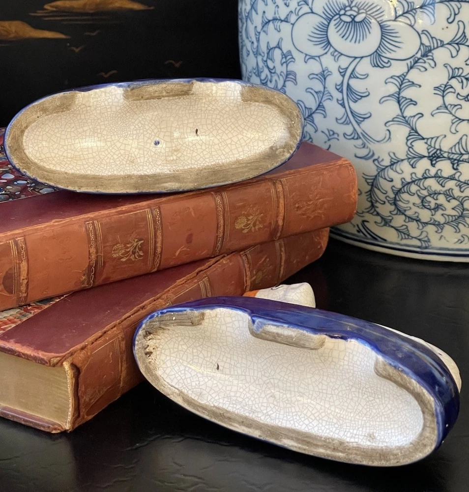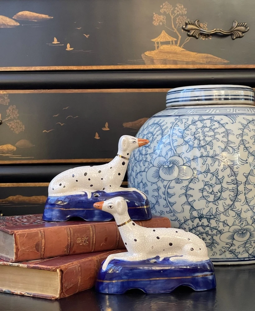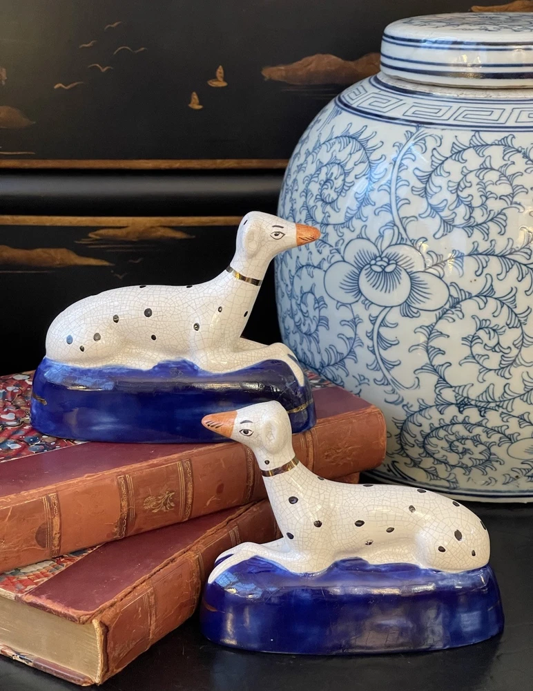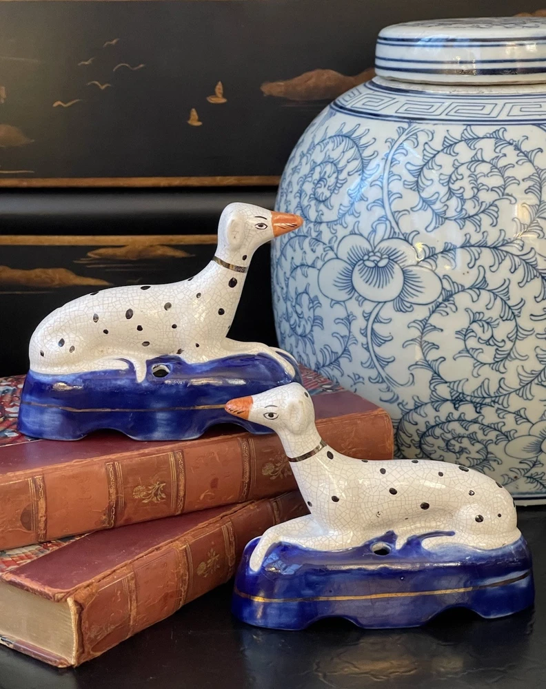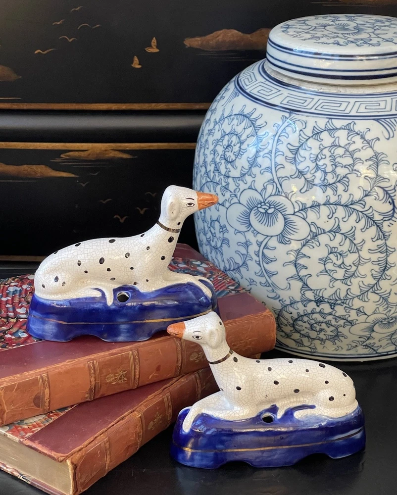 Timeless 19C Antique Original English Porcelain Staffordshire Dalmatian Mantle Dog Ink Well Pair • Height 4” • Length 5.25” • Width 2” This rare gallery quality pair of original 19C antique petite English Staffordshire porcelain dalmatian mantle table dogs is hand painted with spotted coats, burnished gilt collar and cobalt bases on which each figure is seated in semi-recumbent formal pose. Highly desirable and scarce with tan snouts, these elegant period examples will bring a touch of the English countryside to any setting in which they are placed whether paired on their own as a focal point or grouped as part of a collection or arrangement. Condition excellent. Rarely found intact surviving models. Minimal expected age related wear. Display ready.