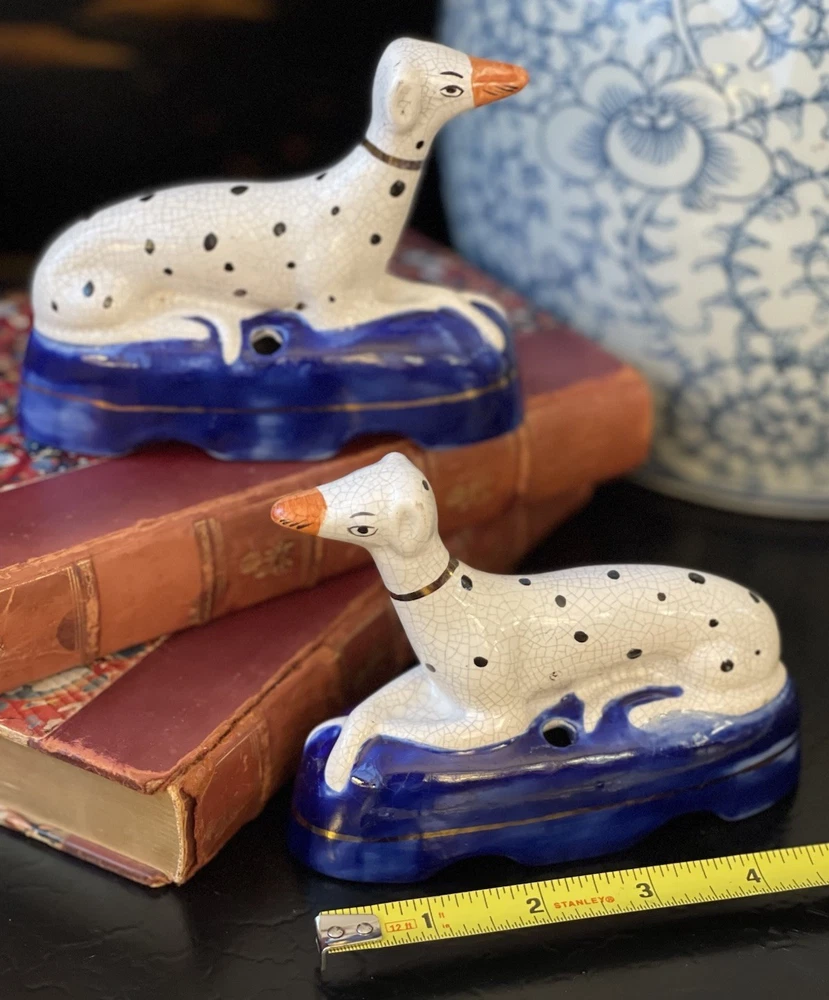 Item arrived just as described on eBay. It took a bit to receive, but it was packaged perfectly! Thank you! You wouldn’t believe how people send things and they are broken due to poor packaging. I love the Staffordshire dogs!