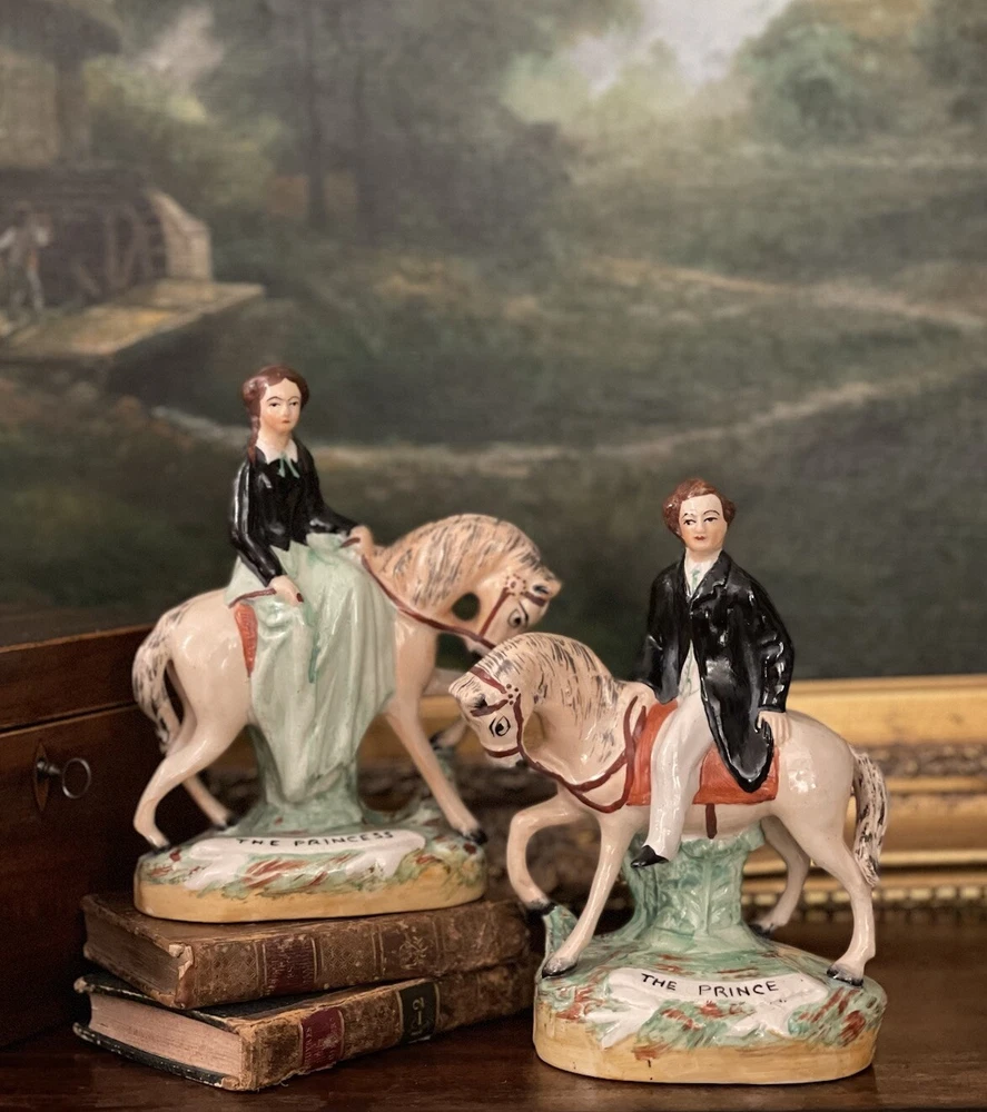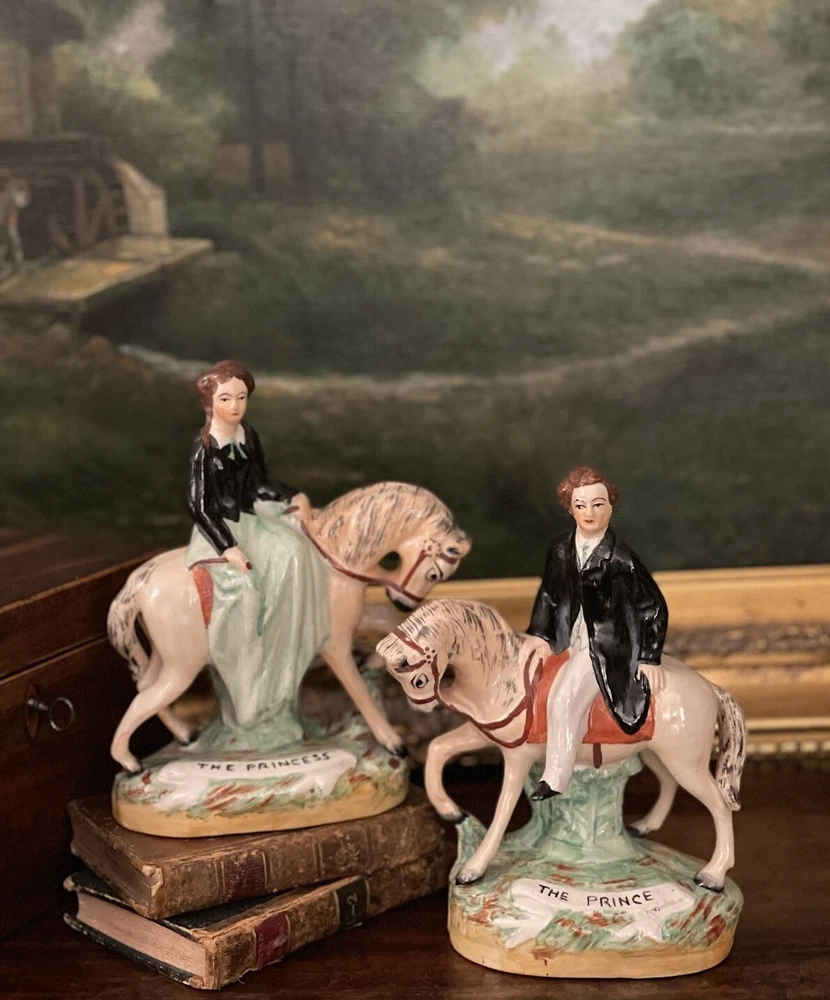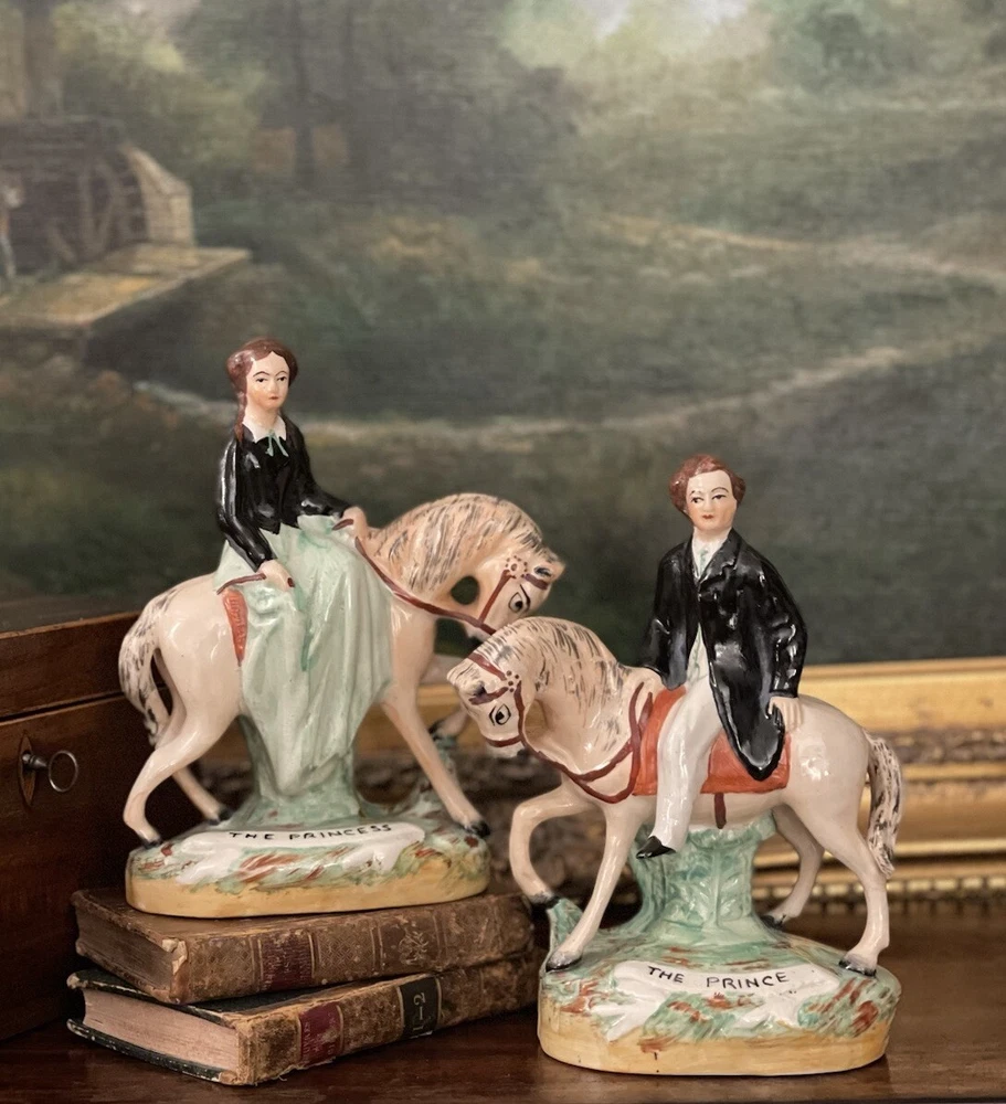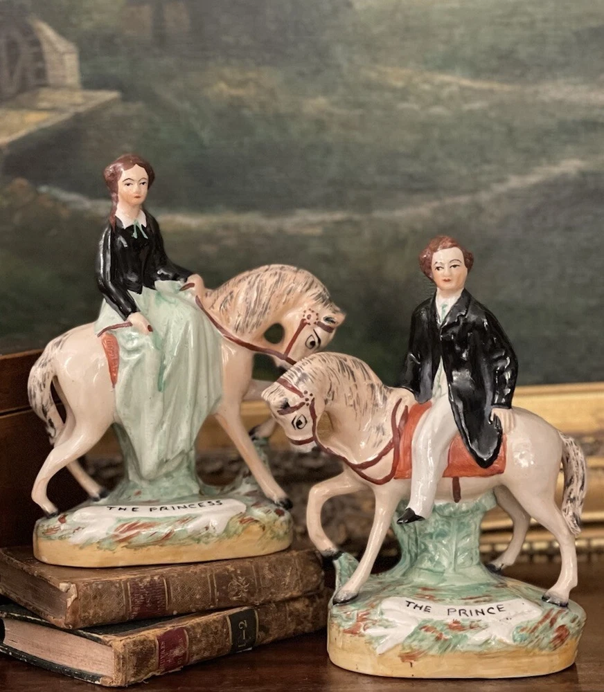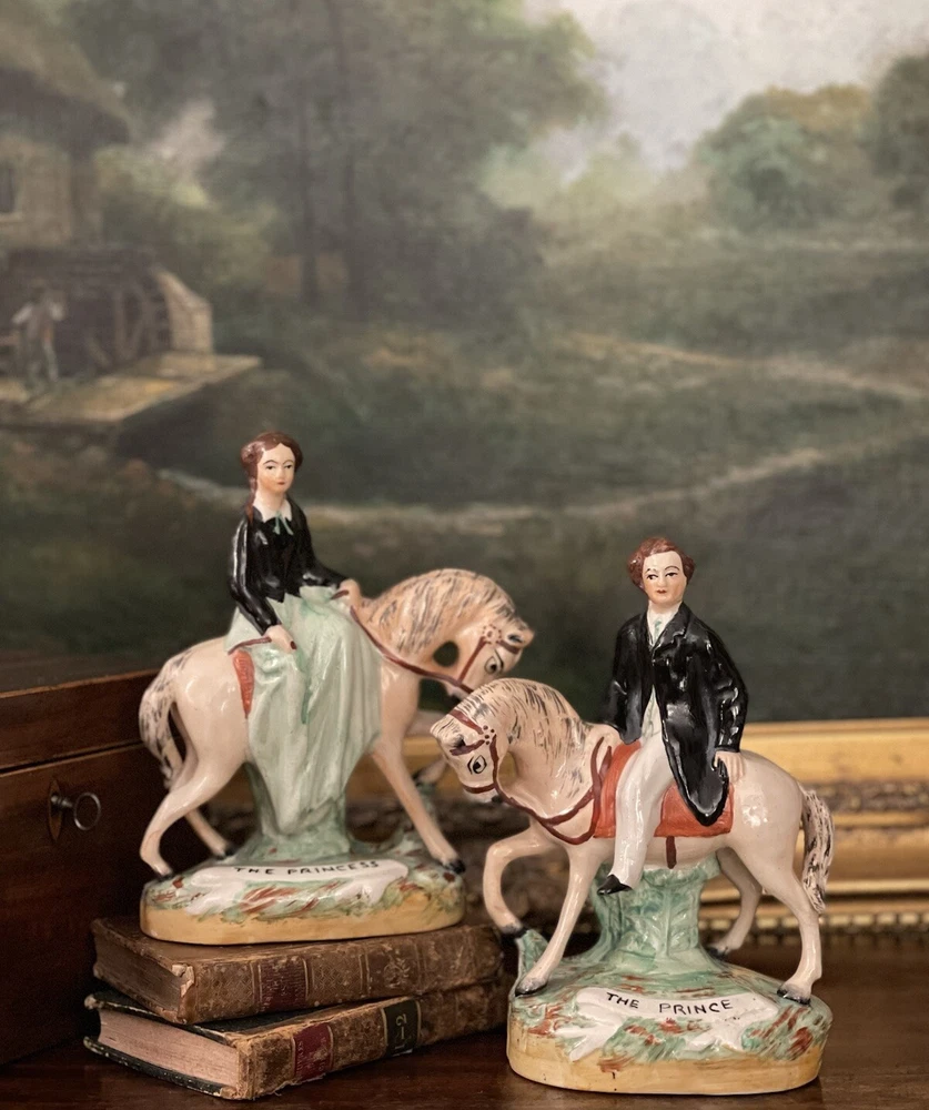 Stunning Rare Antique English Staffordshire Equestrian Mantle Flatback Pair Depicting Elegant Noble Prince and Princess on Horseback β’ Rare Gallery Quality Equestrian Figures β’ Height 7.5β I am delighted to offer this lovely pair of timeless equestrian themed mantle flatbacks featuring elegant right and left facing horses carrying prince and princess (Victoria and Albert) dressed in beautiful riding clothes in classic form from Staffordshire, England. This marvelous statement pair of noble equestrian figures will make elegant showpieces when placed on their own or as a stunning addition to a collection or arrangement. Excellent condition. Marvelous surviving period examples to own and treasure. Turn of century marks to bases. Happy Bidding!! Height 7.5β