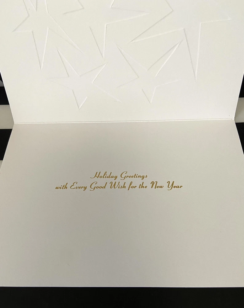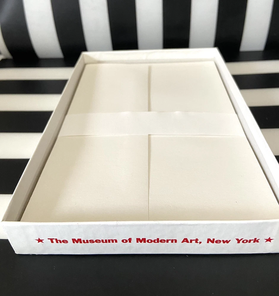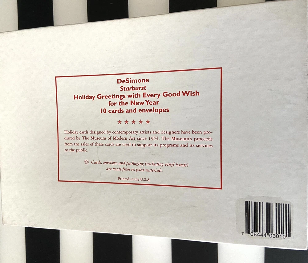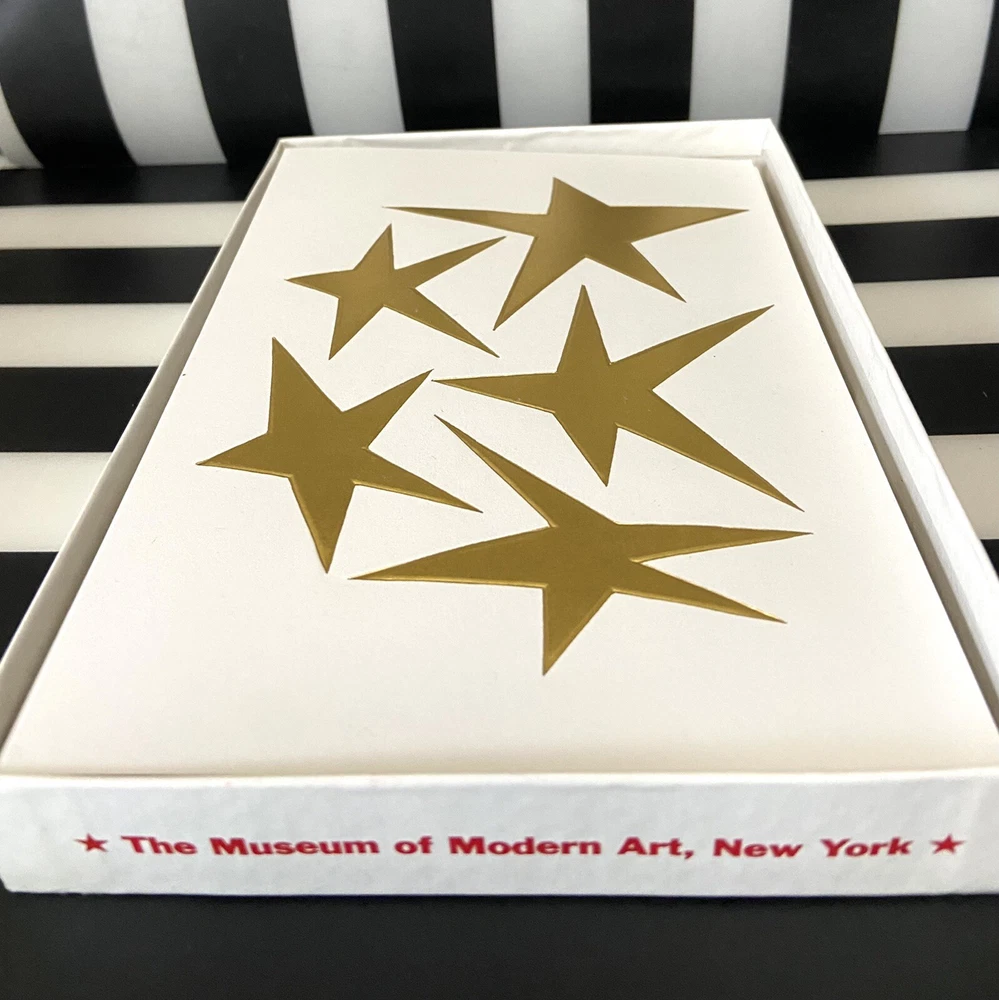 Stationary: EMBOSSED GOLD STARS HOLIDAY GREETING CARDS FOLDED from THE MUSEUM OF MODERN ART NYC Beautiful. Awesome Design. Size 7 7/8 x 5 3/8. NEW-OPEN BOX. was in storage. BOXED SET OF 9 Cards and 9 Envelopes. Premium Papier. PERFECT CONDITION. Was a box of 10 originally. One missing. Never used. Near Mint Condition. Plastic sleeve protecting the boxed cards. ****Comes from a non c19, pet and smoke free home. No international or returns. See photos. What you see is what you get. ****SHIPS VIA PRIORITY MAIL. FAST SAFE INSURED TRACKING TO USA ONLY. It was sold from NEIMAN-MARCUS originally. Vintage from 1990s. Thanks for shopping. Please see other items. 😉
