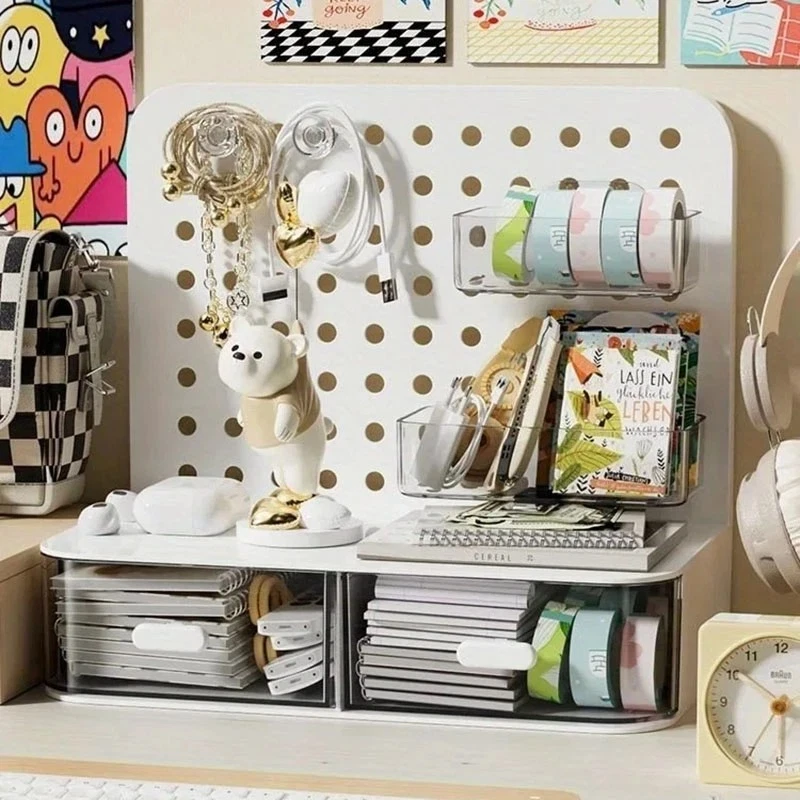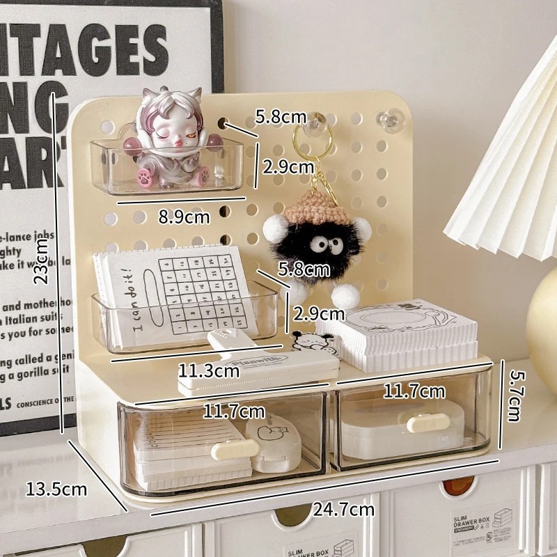 ATTENTION !!! No Extra Fees for US Buyers. Import charges are already included on the price. Stationery Boxes Plastic Storage Board with Drawer Desktop Makeup Organizer Rack Keep your workspace neat and organized with this stylish desktop perforated storage board. Designed with multiple compartments and a drawer, it provides an efficient solution for sorting stationery, pens, makeup, and sundries. The perforated design ensures easy access to your items while maximizing vertical space on your desk. Whether you’re organizing office supplies or storing makeup and small accessories, this versatile organizer helps declutter your desk while adding a modern touch to your space. Compact yet spacious, it’s perfect for both home and office use. Feature: Eco-Friendly:With a 105℃ specification, it ensures safe, eco-conscious storage. Ample Storage: Features a drawer and perforated board design for extensive stationery storage. Material Quality:Crafted from durable plastic, this stationery organizer withstands daily use. Versatile Use:Not just for stationery, it's a versatile makeup storage organizer as well. Space-Saving Design:Compact and perforated, it maximizes desk space without clutter. Specification: Item: Storage Holders & Racks Type: Non-folding Rack Material: Plastic Size: 25x14.5x23cm 24.7x13.5x23cm Color: Transparent Feature: With Drawer Use: Makeup Storage Organizer, Stationery Storage Boxes Pen Sundries Sorting Storage Rack Package Included: 1 x Pc Storage Holders