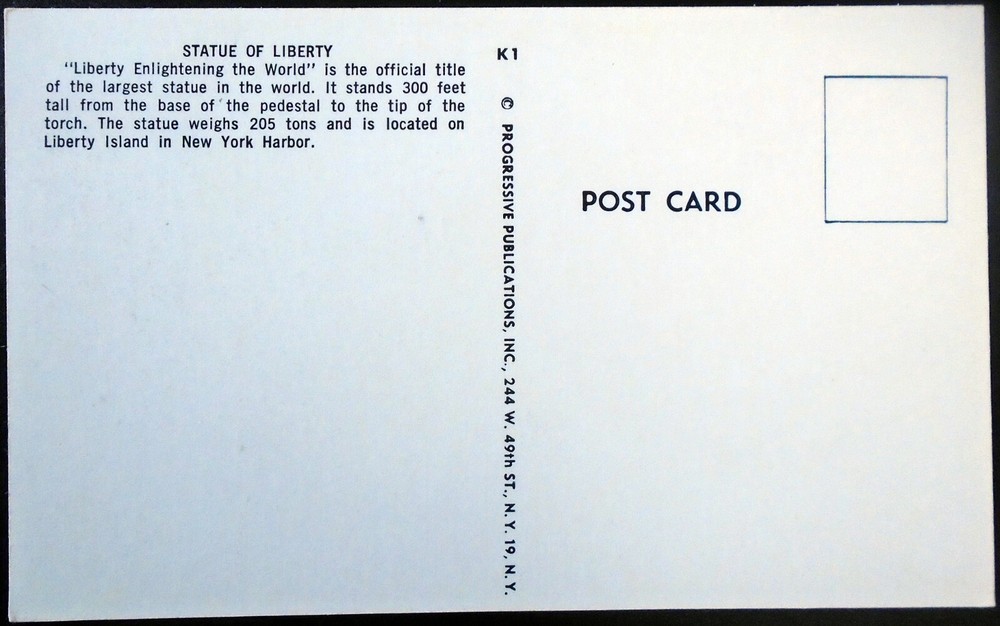 787. CATEGORY: New York TYPE: Color Postcard – Standard (Chrome) DESCRIPTION: Back: “Statue of Liberty. “Liberty Enlightening the World” is the official title of the largest statue in the world. It stands 300 feet tall from the base of the pedestal to the tip of the torch. The statue weighs 205 tons and is located on Liberty Island in New York Harbor.” CONDITION: Unused; not mailed . CONDITION: Minor corner and edge wear. Light soiling and age tanning. Very Good condition. … Sold AS IS. Look carefully at the pictures to Judge Condition for Yourself . Please pay for your order after Combining ALL ITEMS on one invoice! This saves both of us money! You save on S/H charges and I save on fees! If you plan to purchase multiple items, just put all the items you want into your Ebay cart, then press “REQUEST TOTAL” and I will be able to invoice you with combined shipping. Make sure you’re purchasing via computer, as this option is not available when buying with your phone. Once you have purchased an item and we have wrapped it for shipping, additional items CANNOT be added, and must be shipped separately. All postcards, vintage paper items and historical memorabilia are packaged with cardboard.