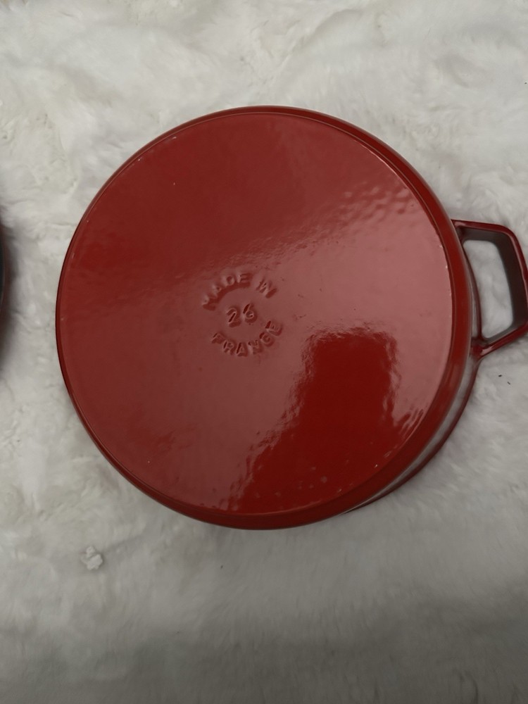 Very good conditions made 26 France 10 1/4 The Staub Enameled Cast Iron Dutch Oven 5.1 QT / 4.9 L in Cherry is a high-quality and durable cookware piece perfect for traditional Dutch cooking. Made from cast iron, this Dutch oven retains heat well and is suitable for a variety of cooking techniques. The rich cherry enamel adds a touch of style to your kitchen while the sturdy construction ensures long-lasting use. With a generous size of 5.1 QT / 4.9 L, this Dutch oven is ideal for creating large batches of soups, stews, and other Dutch oven dishes with ease.