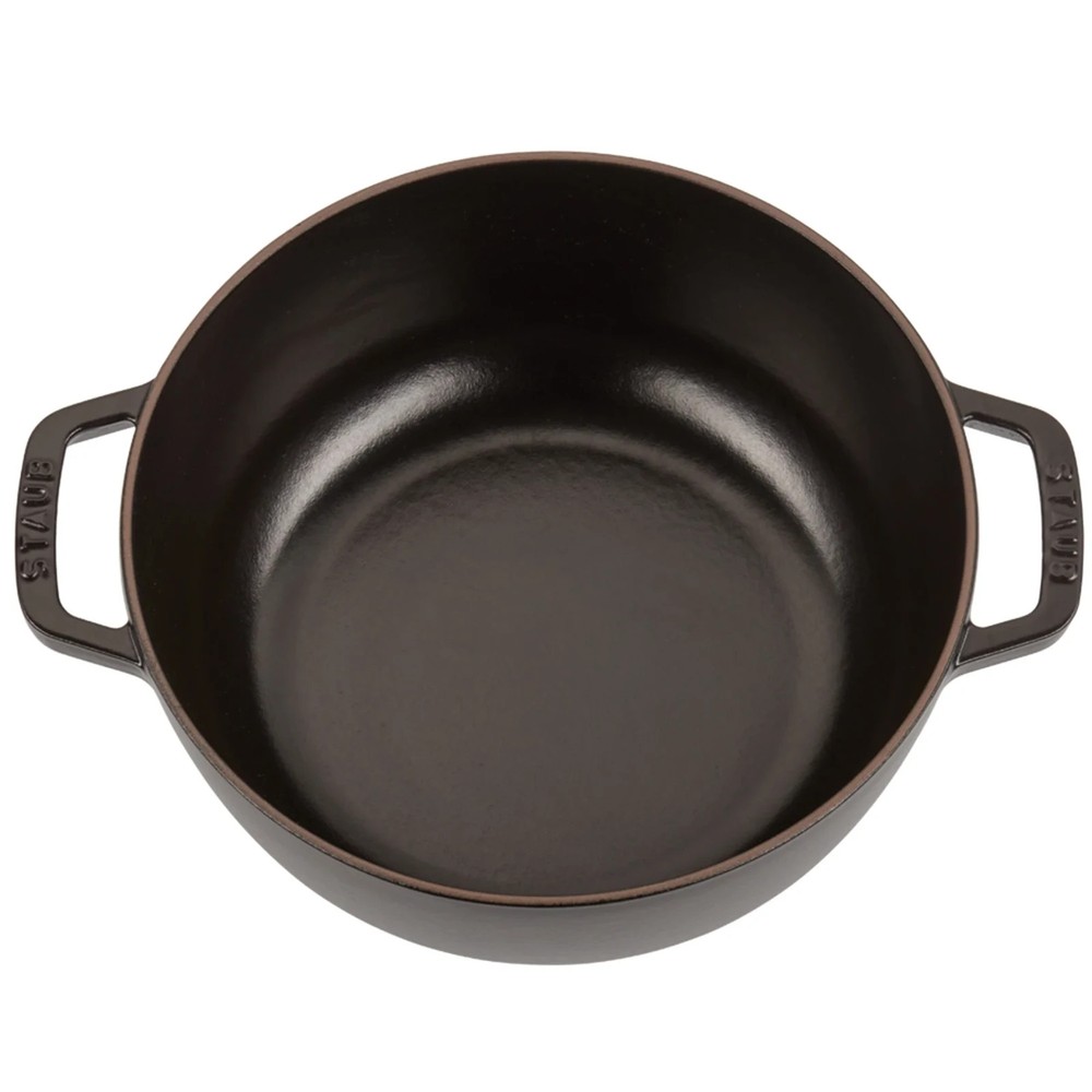 Staub Cast Iron Dutch Oven, 3.75Qt, serves 3-4, Made in France, Black 11732423 Features: Self-basting Chistera spikes continuously keep food moist Exceptional heat distribution and retention cast iron is famous for Matte black enamel interior heats and enhances caramelization excellent searing Versatile design goes from oven to table Enameled cast iron is easy to clean and does not require seasoning Iconic Staub handles with ergonomic grip Made in France. Staub Cast Iron Dutch Oven, 3.75Qt, serves 3-4, Made in France, Black 11732423 Specifications: Material Cast Iron Brand STAUB Capacity 3.75 Quarts Color Black Finish Type Enameled Shape Round Product Care Instructions Hand Wash Only With Lid Yes Is Oven Safe Yes Item Weight 10.5 Pounds Lid Material Cast Iron Is Dishwasher Safe No Product Dimensions 25"W x 13"H Manufacturer Staub Item Weight 10.5 pounds Self-basting Chistera spikes continuously keep food moist Exceptional heat distribution and retention cast iron is famous for Matte black enamel interior heats and enhances caramelization, excellent searing Versatile design goes from oven to table Enameled cast iron is easy to clean and doesn't require seasoning Iconic Staub handles with ergonomic grip Made in France.