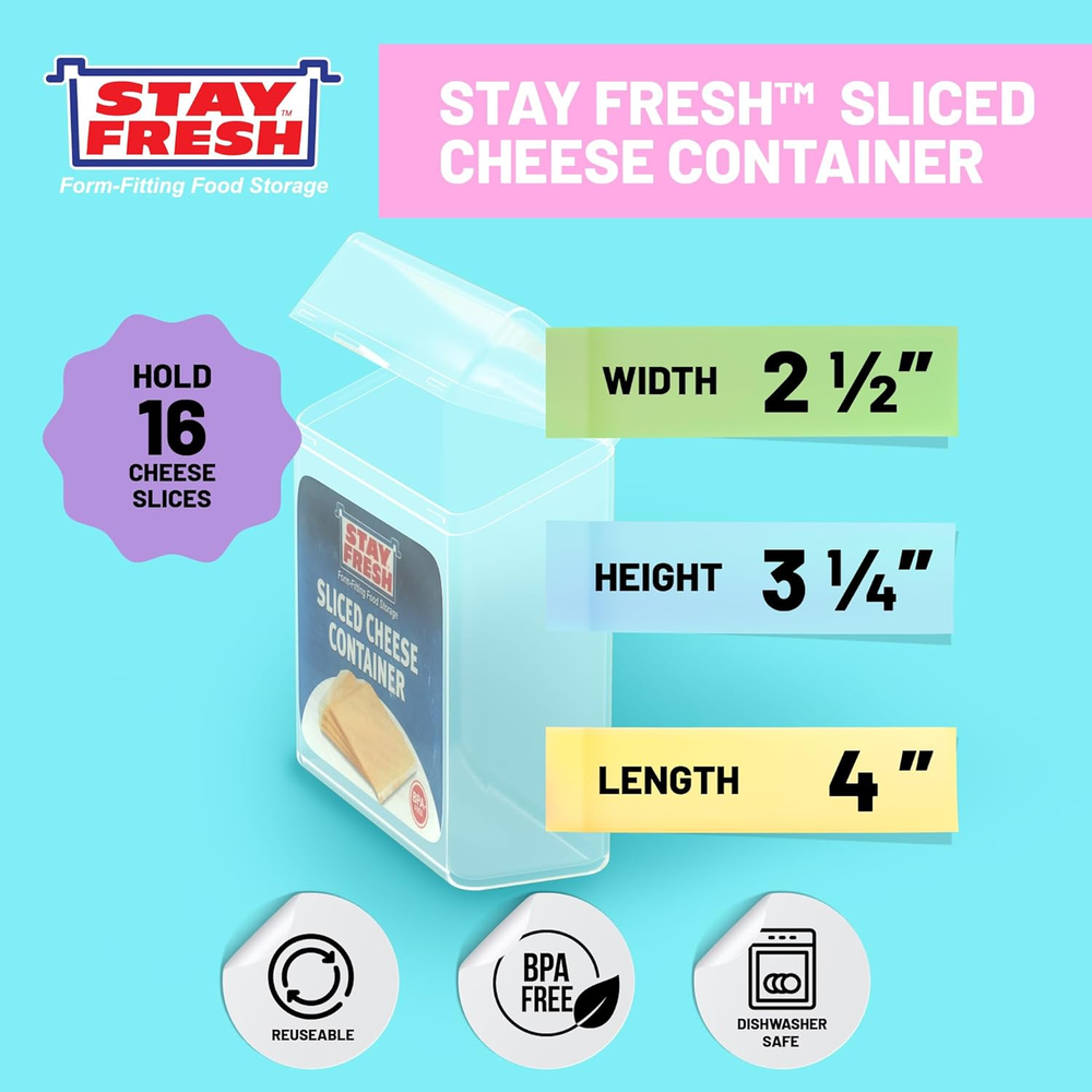 Longer Lasting Slice Cheese Storage - With our form fitting box with lid, that locks in moisture and prevents premature spoilage. This means covered cheese that is better tasting and can last up 2 months longer in the refrigerator than uncovered cheese singles. Holds 16 Individually Wrapped Cheese Slices - the small clear plastic reusable cheese storage, allows you to easily see what's inside and how much is left in the fridge. Dishwasher Safe and Reusable - Made from a durable polymer material that is BPA free and lightweight. You can do the dishes simply by placing the cheese holder on the top rack of your dishwasher for an easy clean. Picnic, Boat or Camping Cheese Storage- with the secure locking cover you can take it with you and keep away flies, or other bugs while enjoying the outside. Stay Fresh Promise - All of our Kitchen storage solutions are designed to fully contain everyday foods that are non-recloseable and difficult to store and maintain. Enjoy the original just opened flavor and quality of foods contained by Stay Fresh Product Description