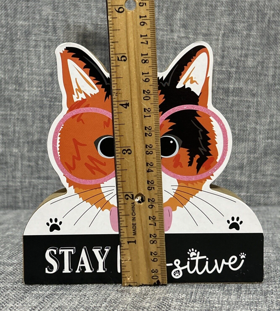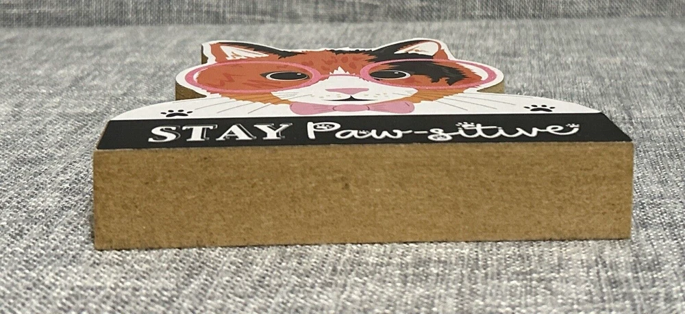 Cute Stay Paw-sitive Wood Calico Cat Sign Standee Pink Glitter Glasses Positivity Desk Happy Pre-Owned - Please see Pictures for Details Set Stage Photoshoot Background Artist Prop Project Decor Decoration