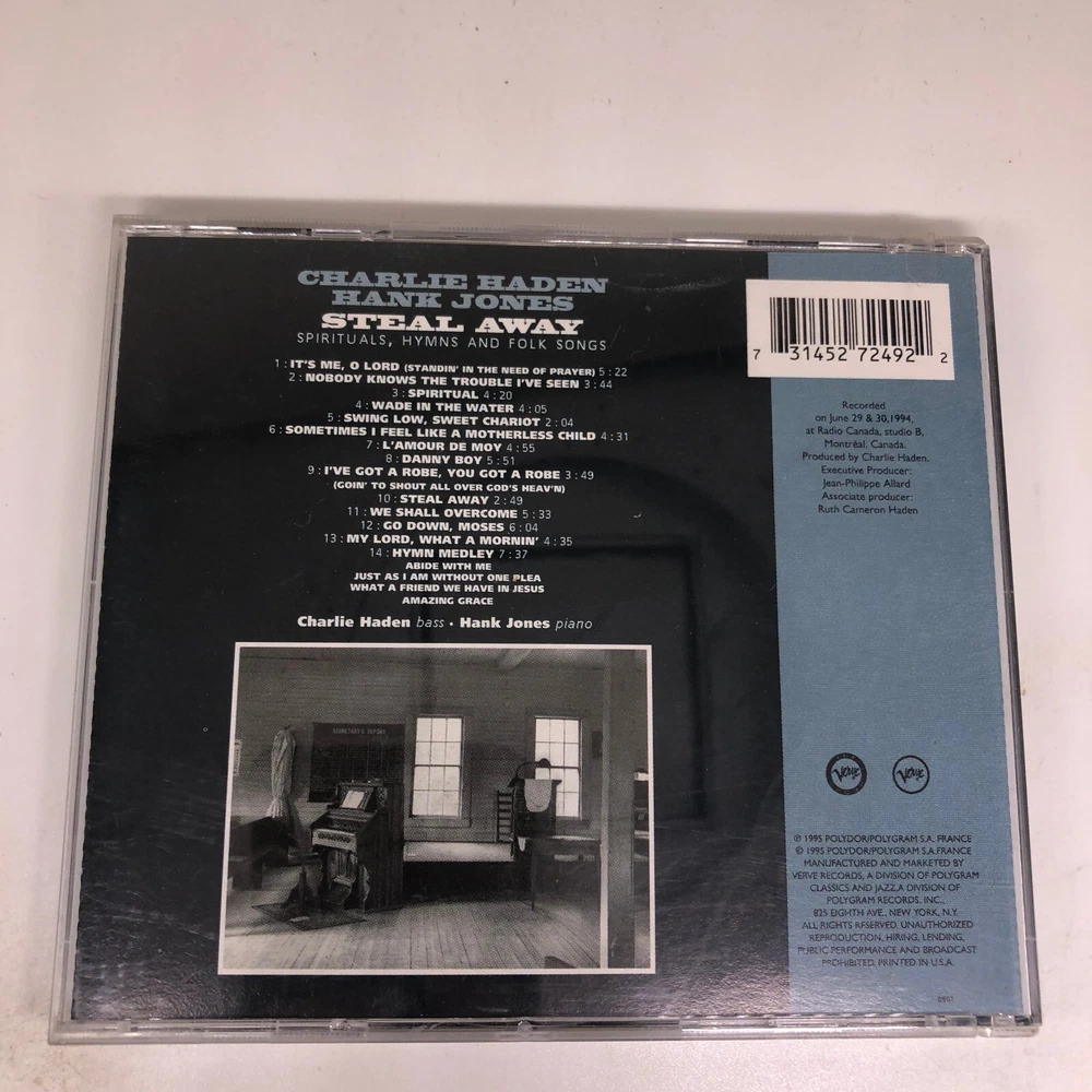 Record Label: PLG, PolyGram Records Producer: Charlie Haden Case Type: Jewel Case: Standard CD Grading: Good (G) Seller Notes: “Guaranteed to play fine, some minor scratches and blemishes can be expected. Cases may be damaged.” Release Title: Steal Away: Spirituals Hymns & Folk Songs Inlay Condition: Good (G) gtin13: 0731452724922 Genre: Jazz Case Condition: Good (G) UPC: 0731452724922 Release Year: 1995 Format: CD Type: Album Artist: Haden, Charlie / Jones, Hank