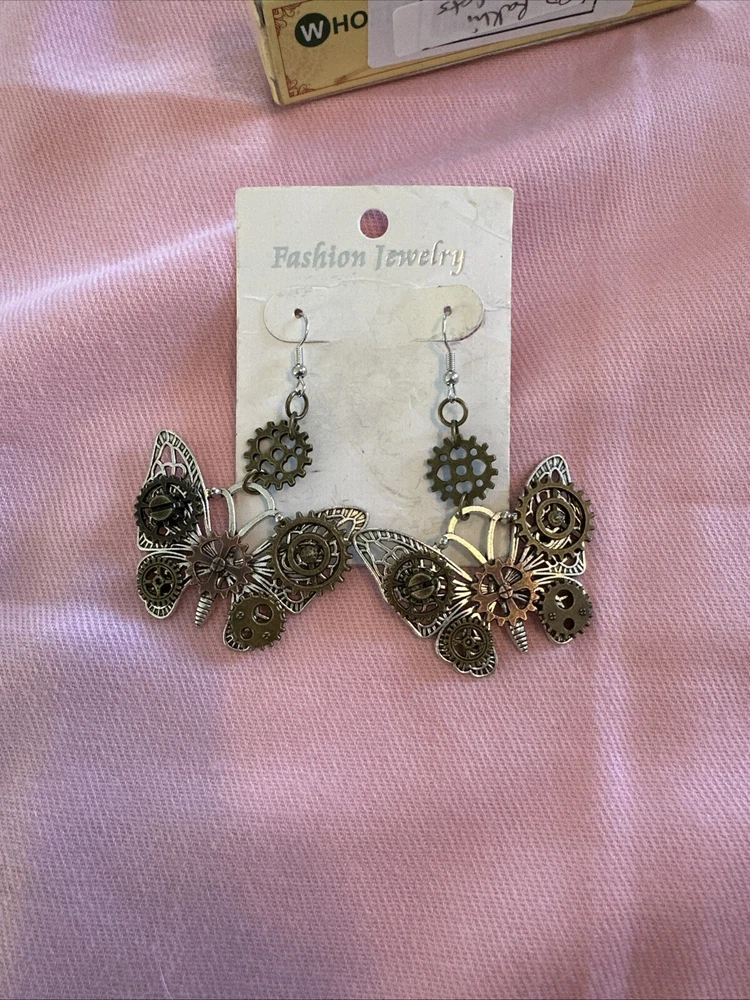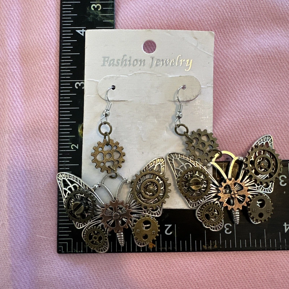 Steampunk Antique Butterfly Earrings Goth Vintage Gear Burning Man Accessories