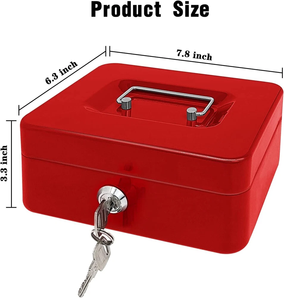Steel Cash Box with Key Lock, Metal Small Money Organizer Red - 8 inch Product Details Brand: PACOLO Product Dimensions: 5.9"D x 3.1"W x 4.7"H Lock Type: Key Color: Red - 8 inch Material: Alloy Steel, Metal Special Feature: Key Lock Mounting Type: Floor Mount Control Type: Key Control Included Components: Stainless Steel, Alloy Steel, Plastic, Metal Water Resistance Level: Not Water Resistant Chamber Depth: 5.9 Inches Manufacturer: PACOLO Part Number: Steel Cash Box with Key Lock Item Weight: 1.74 pounds Country of Origin: China Item model number: Steel Cash Box Special Features: Key Lock Batteries Included?: No Batteries Required?: No Brand: PACOLO Product Dimensions: 5.9"D x 3.1"W x 4.7"H Lock Type: Key Color: Red - 8 inch Material: Alloy Steel, Metal Special Feature: Key Lock Mounting Type: Floor Mount Control Type: Key Control Included Components: Stainless Steel, Alloy Steel, Plastic, Metal Water Resistance Level: Not Water Resistant Size and Color: Exterior dimensions: 7.8 inch x 6.3 inch x 3.3 inch; Four colors(Black, White, Red, and Blue) are available for you to choose from. Key Lock: This cash box has a key lock to keep valuables safe. The key is easy to operate and can be opened with one hand. Removable Tray: This cash box has a removable tray with six compartments for excellent coin organization and a layer underneath the tray for storing cash and checks. Highly Quality: This solid steel cash box does not fear knocks and shocks.Suitable for storing bills, coins, checks, and receipts. The lock box is lightweight with a convenient handle, so you can take it anywhere and hide it easily. Wide Application: This money box with a key is suitable for indoor or outdoor small businesses, commercial supermarkets, stores, lockers, cabinets, and family use. It is also a perfect gift for your friends and family for birthdays, Mother’s Day, or Christmas. Suitable for storing bills, coins, checks, and receipts.