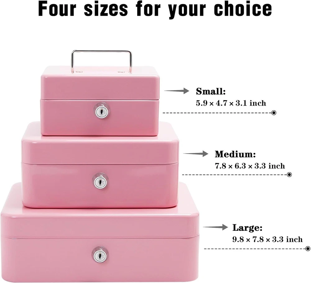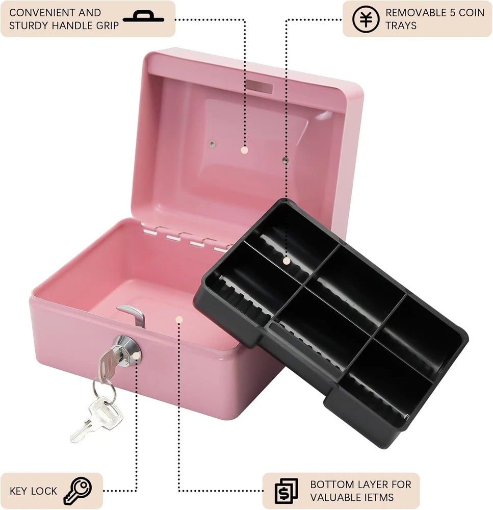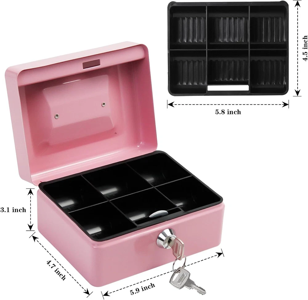 Steel Cash Box with Key Lock, Metal Small Money Pink - 5.9" x 3.1" x 4.7" Product Details Brand: PACOLO Product Dimensions: 5.9"D x 3.1"W x 4.7"H Lock Type: Key Color: Pink - 5.9" x 3.1" x 4.7" Material: Stainless Steel, Alloy Steel Special Feature: Key Lock Mounting Type: Floor Mount Control Type: Key Control Included Components: Stainless Steel, Alloy Steel, Plastic, Metal Water Resistance Level: Not Water Resistant Chamber Depth: 5.9 Inches Manufacturer: PACOLO Item Weight: 1.21 pounds Country of Origin: China Item model number: Steel Cash Box with Key Lock Special Features: Key Lock Batteries Included?: No Batteries Required?: No Brand: PACOLO Product Dimensions: 5.9"D x 3.1"W x 4.7"H Lock Type: Key Color: Pink - 5.9" x 3.1" x 4.7" Material: Stainless Steel, Alloy Steel Special Feature: Key Lock Mounting Type: Floor Mount Control Type: Key Control Included Components: Stainless Steel, Alloy Steel, Plastic, Metal Water Resistance Level: Not Water Resistant Size And Color:Exterior dimensions: 4.9 inch x 3.74 inch x 2.16 inch,4 colors(Black, White,Pink and Blue) available for you to choose. Key Lock:This cash box has a key lock to keep valuables safe. The key is easy to operate,can open it no problem with one hand. Removable Tray:This cash box has a removable tray with 6 compartments which makes for great coin organization,as well as a layer underneath the tray for storing cash and checks. Highly Quality:This cash boxes is made of high quality steel which is solid and not afraid of knocks and shocks.Suitable to store bills, coins, checks and receipts.The lock box is lightweight with a convenient handle, so you can take it to anywhere and hide it easily. Wide Application:This money box with key is suitable for indoor or outdoor small business,commercial supermarket,store,lockers, cabinets, family use.It also is a perfect gift for Birthday, Mother’s day,Christmas for your friends and family. Suitable to store bills, coins, checks and receipts.