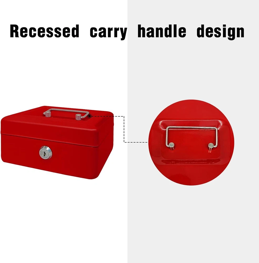 Steel Cash Box with Key Lock, Metal Small Money Red - 5.9" x 3.1" x 4.7" Product Details Brand: PACOLO Product Dimensions: 5.9"D x 3.1"W x 4.7"H Lock Type: Key Color: Red - 5.9" x 3.1" x 4.7" Material: Stainless Steel, Alloy Plastic, Metal Special Feature: Key Lock Mounting Type: Floor Mount Control Type: Key Control Included Components: Stainless Steel, Alloy Steel, Plastic, Metal Water Resistance Level: Not Water Resistant Chamber Depth: 5.16 Inches Manufacturer: PACOLO Part Number: Steel Cash Box with Key Lock Item Weight: 1.1 pounds Country of Origin: China Item model number: Steel Cash Box Special Features: Key Lock Batteries Included?: No Batteries Required?: No Brand: PACOLO Product Dimensions: 5.9"D x 3.1"W x 4.7"H Lock Type: Key Color: Red - 5.9" x 3.1" x 4.7" Material: Stainless Steel, Alloy Plastic, Metal Special Feature: Key Lock Mounting Type: Floor Mount Control Type: Key Control Included Components: Stainless Steel, Alloy Steel, Plastic, Metal Water Resistance Level: Not Water Resistant Size and Color: Exterior dimensions: 4.9 inch x 3.74 inch x 2.16 inch; Four colors(Black, White, Red, and Blue) are available for you to choose from. Key Lock: This cash box has a key lock to keep valuables safe. The key is easy to operate and can be opened with one hand. Removable Tray: This cash box has a removable tray with six compartments for excellent coin organization and a layer underneath the tray for storing cash and checks. Highly Quality: This solid steel cash box does not fear knocks and shocks.Suitable for storing bills, coins, checks, and receipts. The lock box is lightweight with a convenient handle, so you can take it anywhere and hide it easily. Wide Application: This money box with a key is suitable for indoor or outdoor small businesses, commercial supermarkets, stores, lockers, cabinets, and family use. It is also a perfect gift for your friends and family for birthdays, Mother’s Day, or Christmas. Suitable for storing bills, coins, checks, and receipts.