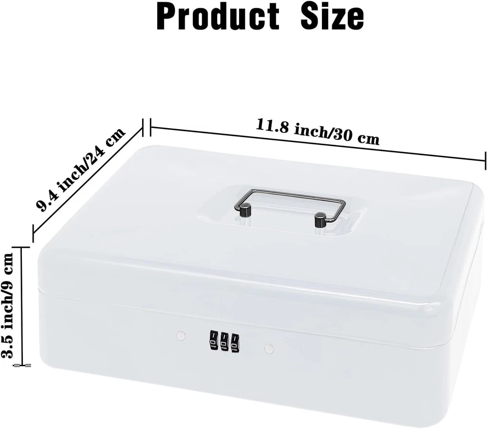 Steel Cash Box with Key Lock, Metal Small Money White- 11.8" x 9.4" x 3.5" Product Details Brand: PACOLO Product Dimensions: 5.9"D x 3.1"W x 4.7"H Lock Type: Key Color: White- 11.8" x 9.4" x 3.5" Material: Alloy Steel, Metal Special Feature: Key Lock Mounting Type: Floor Mount Control Type: Key Control Included Components: Stainless Steel, Alloy Steel, Plastic, Metal Water Resistance Level: Not Water Resistant Chamber Depth: 5.9 Inches Manufacturer: PACOLO Item Weight: 3.3 pounds Country of Origin: China Item model number: Steel Cash Box Special Features: Key Lock Batteries Included?: No Batteries Required?: No Brand: PACOLO Product Dimensions: 5.9"D x 3.1"W x 4.7"H Lock Type: Key Color: White- 11.8" x 9.4" x 3.5" Material: Alloy Steel, Metal Special Feature: Key Lock Mounting Type: Floor Mount Control Type: Key Control Included Components: Stainless Steel, Alloy Steel, Plastic, Metal Water Resistance Level: Not Water Resistant Size And Color:Exterior dimensions: 11.8 inch x 9.4 inch x 3.5 inch,4 colors(Black, White,Pink and Blue) available for you to choose. Key Lock:This cash box has a key lock to keep valuables safe. The key is easy to operate,can open it no problem with one hand. Removable Tray:This cash box has a removable tray with 6 compartments which makes for great coin organization,as well as a layer underneath the tray for storing cash and checks. Highly Quality:This cash boxes is made of high quality steel which is solid and not afraid of knocks and shocks.Suitable to store bills, coins, checks and receipts.The lock box is lightweight with a convenient handle, so you can take it to anywhere and hide it easily. Wide Application:This money box with key is suitable for indoor or outdoor small business,commercial supermarket,store,lockers, cabinets, family use.It also is a perfect gift for Birthday, Mother’s day,Christmas for your friends and family. Suitable to store bills, coins, checks and receipts.