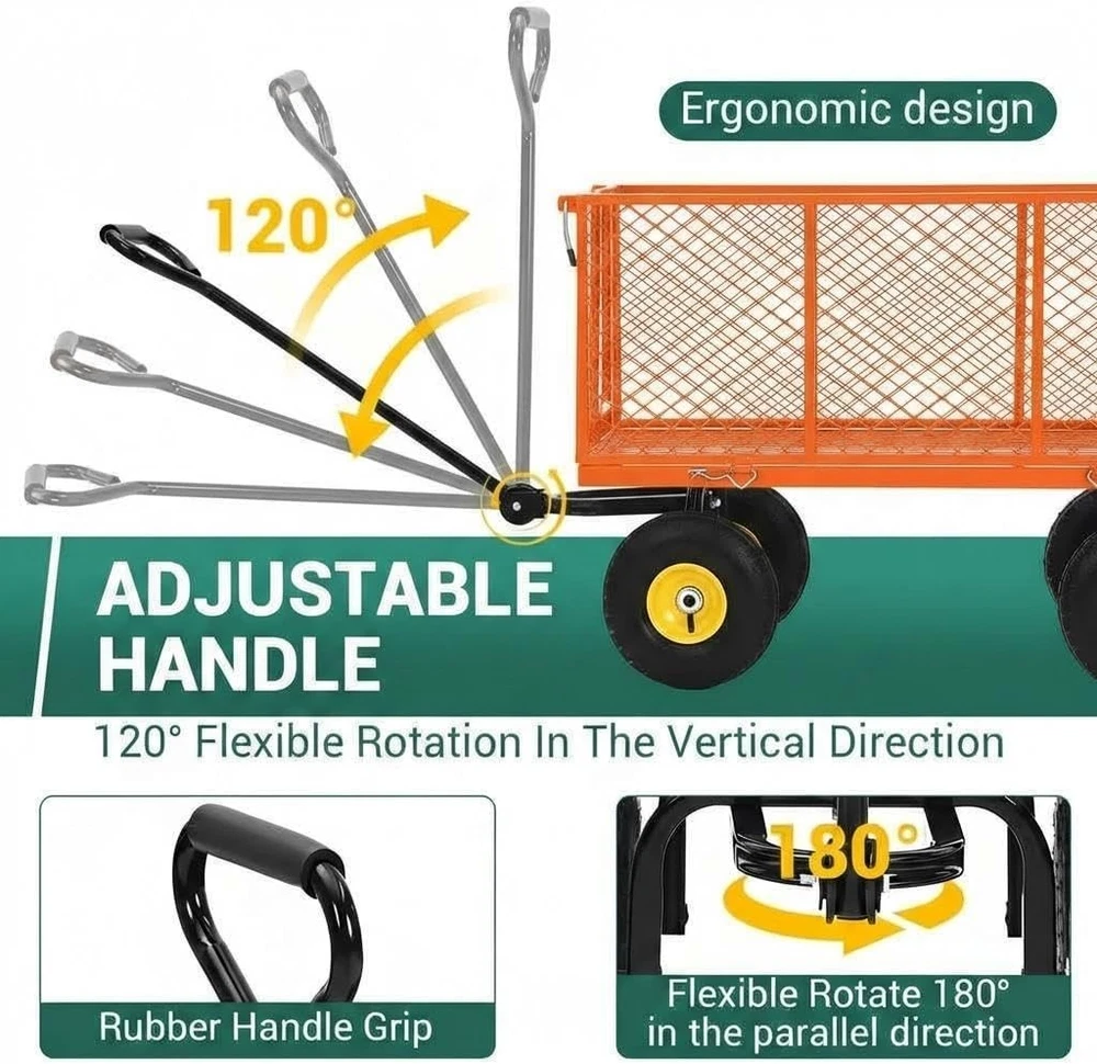 Steel Garden Cart 1100lb Capacity Heavy Duty Yard Wagon Utility Cart 10in Tires About this item: 【 Heavy-Duty Load Capacity】Engineered for serious hauling, this heavy-duty steel garden cart supports up to 1100 lbs, making it the perfect partner for moving heavy soil, rocks, mulch, and firewood. Whether you're working on a farm, yard, or landscaping project, this robust metal wagon provides a reliable solution for all your outdoor transportation needs. 【Versatile 3-in-1 Design with Removable Sides】Maximize your gardening efficiency with our flexible 3-in-1 garden wagon. The removable mesh sides allow you to easily convert the unit from a traditional fenced cart to a flatbed wagon for hauling oversized loads like logs or large equipment. This multi-functional utility cart is a must-have for diverse outdoor scenarios. 【10" All-Terrain Pneumatic Tires】Equipped with 10-inch heavy-duty pneumatic rubber tires, this utility garden cart provides excellent shock absorption and stability. These wear-resistant, all-terrain wheels ensure a smooth and quiet ride across gravel paths, muddy fields, or green grass, reducing the effort required for heavy outdoor hauling. 【180° Rotating Handle & Easy Steering】Navigate through tight spaces and sharp corners with ease. Our garden cart wagon features a 180-degree swivel handle with an ergonomic cushioned grip to reduce hand fatigue. The responsive steering design ensures effortless control, even when the metal garden wagon is fully loaded with heavy gardening supplies. 【Durable All-Steel Construction & Rust-Resistant】Crafted from high-quality reinforced steel, the steel mesh bed is built for industrial-strength durability. The powder-coated finish ensures exceptional rust resistance, allowing the lawn cart to withstand harsh weather conditions. Invest in a reliable Specif ication : Type: Garden Cart Material: Steel Load Capacity: 1100 lb Color: Orange Features: with 10" All-Terrain Wheels, 180° Rotating Handle & Removable Sides Includ ed : 1 x Garden Cart Payment Delivery details Returns details Feedback Payment We accept Payoneer only. All major credit cards are accepted through secure payment processor PayPal. Payment must be received within 7 business days of auction closing. If you have bought multiple items from me, you can send me one payment for all the items instead of paying for them individually. When you click the Pay Now button, eBay will automatically determine if there are other items you have won or purchased from me and will combine them for your review. NOTE: Import duties, taxes and chargers are not included in the item price or shipping charges. These charges are the buyer's responsibility. Please check with your country's customs office to determine what these additional costs will be prior to bidding buying. Delivery details 1. We will delivery out at the handing time when we receive the payment. 2. The delivery time is 3-5 business days to US by usually time.The parcel maybe delay 1-2day of the weekend.Due to the bad weather,Holidays,Hot Season ect.the parcel maybe delay,If you have any problems,mssage us,we will try our best to solve it. 3. We ship to your eBay address. Please make sure your eBay address is correct before you pay. 4. If you want to change the shipping address,message us before our send out. 5. We cannot deliver your order if your state is PR. Returns details 1. If you donot receive the items at the delivery time,the parcel has broken/missing,Please message us before you open case/return,we will try our best to solve it. 2. We offer a 30 day return policy from checkout winning date. 3. An RMA number is required for all returns. Message us for return instructions. Items Returned without a RMA number will not be processed. 4. Items defective upon receipt must be packaged in their retail packaging as if new and returned with a detailed description of the problem. 5. Return shipping fees are not refundable. We reserve the right to decline any returns if the above guidelines are not followed. Feedback If you are not satisfied with the item for any reason, please do not quick to leave negative/neutral feedback even open request and case without any communication with us. We devote ourselves making EVERY CUSTOMER in 100% Satisfactory and resolve any problem. Thank you for your understanding and recognition,we are always leave positive feedback to all our customers. Reply: All replies will be sent to your email box, if you do not get response within 24 hours (Sat. & Sun. excluded) please check your eBay My Messages in case that our emails will be filtered automatically by your settings. Brand Unbranded Type 4-Wheeled Wheelbarrow Weight Capacity 1100 lbs Capacity 1100 lbs Color Orange Wheel Diameter 10 in Material Steel Number of Wheels 4 Suitable For Gardening