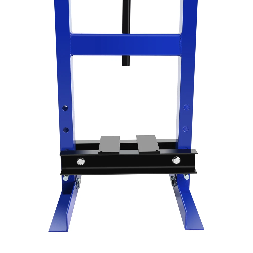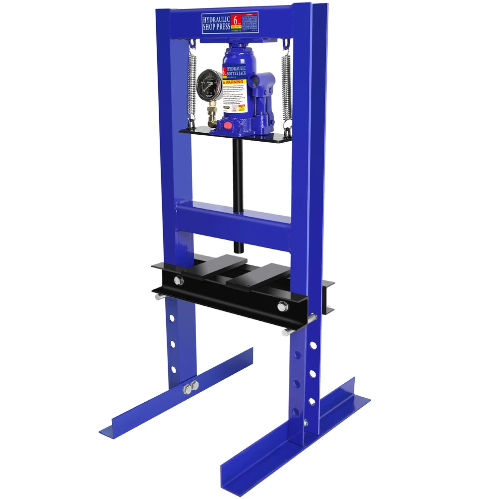 Specification Product Information Item Code: W1239124308 Product Type: General Item Product Name: Steel H-Frame Hydraulic Garage/Shop Floor Press with Stamping Plates, with pressure gauge,6 Ton Capacity, Blue Main Color: Blue Main Material: Steel Rated Load: 6 ton (with pressure gauge) Product Dimensions Assembled Length (in.): 19.69 Assembled Width (in.): 19.69 Assembled Height (in.): 35.43 Weight (lbs.): 50.71 Package Size Length (in.): 37.01 Width (in.): 18.11 Height (in.): 4.33 Weight (lbs.): 53.57 Product Features Wide Application: The shop press with a pressure gauge, you can always see the changes in pressure. With a range of 2.2" to 9.4", The hydraulic shop press can be used for bending or straightening metal. And adjusting the height is a breeze thanks to the convenient pin system. Two movable stamping plates are perfect for securing small parts during use. 6 ton Capacity: The capacity of the equipped bottle jack is 6 Ton. It can help straightening or bending metal more easily. This press can be used for metalworking tasks like bending, straightening, and stamping. Strong and Stable: The H-shaped frame structure provides a sturdy base, and you will not wobble or shake during use. Besides our hydraulic press boasts a robust carbon steel body. High quality precision springs: The spring can slowly and safely bouncing back after pressing down operation; Piston-ram is treated and polished to resist skiving. The hydraulic shop press can be operated easily by simply pressing or lifting the long handle for the bottle jack. Safe and Convenient: The relief valve kicks in automatically when the pressure exceeds 6T, avoiding any overpressure-related damage to the workbench. There are 4 holes on each side of the hydraulic shop press for height adjustment of the working table. You can adjust the height of the working table based on your needs. Description On Jul 25, 2024 at 00:08:40 PDT, seller added the following information:
