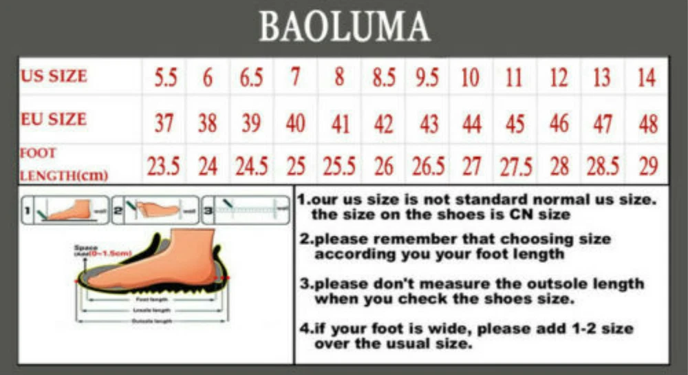Welcome to my store Products Description and Details Product Display Gender: Men Material: Soft, comfortable material Style:fashion/casual wear sizes available :US6.5-US 14 Package included: Only 1 Pair Note: H ere are some tips about size before you buy it, Please choose the shoes size according to your foot length, NOT insole length. If your feet is w ide or thick, please choose a larger shoes size. Before choose you USA size , you'd better measure your feet length. How to Measure Feet Length Please measure your feet length carefully, with the method of the picture below: Size: US SIZE 6.5=EU SIZE 39=Foot length =9.64 inches= 24.5cm US SIZE 7=EU SIZE 40=Foot length =9.84 inches= 25.0cm US SIZE 8=EU SIZE 41=Foot length =10.04 inches= 25.5cm US SIZE 8.5=EU SIZE 42=Foot length =10.24 inches= 26.0cm US SIZE 9.5=EU SIZE 43=Foot length =10.43 inches= 26.5cm US SIZE 10=EU SIZE 44=Foot length =10.63 inches= 27.0cm US SIZE 11=EU SIZE 45=Foot length =10.84 inches= 27.5cm US SIZE 12=EU SIZE 46=Foot length =11.05 inches= 28.0cm US SIZE 13=EU SIZE 47=Foot length =11.22 inches= 28.5cm Payment 1.We accept PayPal only. 2.All major credit cards are accepted through secure payment processor PayPal. 3.Payment must be received within 7 business days of auction closing. Shipping 1.We ship to your eBay or Paypal address. Please make sure your eBay and Paypal address is correct before you pay. 2.Items will be shipped within 1-4 business day when we received payment. 3.Delivery time depends on destinatio n and other factors; Return Policy All the items may be exchanged or refunded within 30 days of purchase. Returning item must be in same condition as sold. New in original package with all original accessories. Without any damages, scratches or signs of use. Contact *Pl ease contact us first with any issue, before leaving a feedback or contacting eBay. We're ready to assist you and provide the best communication to fix the existed problem. Thank you.