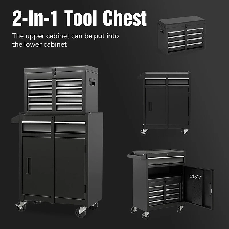 Product Features 【High-quality Material】: Made of high-quality cold-rolled steel, sturdy and durable. The surface of the toolbox is coated with a high-quality anti-rust coating to prevent rust. The high-quality coating prevents damage and corrosion. 【Easy Moving& Storing】 Top box with 2 handles, easy to take and lift, and bottom tool cabinet with hand bars, which help you to move forward. More amazing, the top box can be stored into bottom cabinet, saving your space.Equipped with 4 universal wheels (2 with brakes), the rolling tool chest can be easily moved anywhere, and is fixed in place to increase security. The convenient rod helps you push it more easily. 【Convenient & Safe】: There are detachable handle and hooks on the side of the toolbox. The handle can help you move the toolbox easily. Four hooks can be used to hang your commonly used tools, very convenient. The upper box is equipped with locks to protect your tools safely. 【Detachable & Widely Use】: The whole storage cabinet could be detached into 2 boxes, the upper box has four drawers, the bottom cabinet has one drawer, you can use them separately or together, also you can use it in the garage or workshop. 【Easy to Clean】 Our clearance tool chest is rustproof, scratch-resistant, and easy to clean. The EVA padding inside drawers provides excellent cushioning and heat insulation, protecting your tools from damage.
