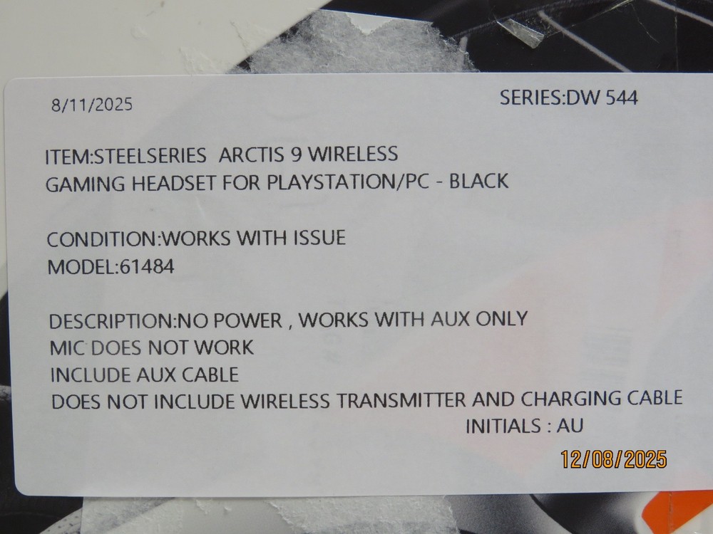 SteelSeries Arctis 9 On-Ear Wireless Gaming Headset - Black [DW544] Functional Condition: Tested and Functional. ISSUE: NO POWER WORKS WITH AUX ONLY Cosmetic Condition: This is a Used Item and Normal Wear (Scuffs & Scratches) is Expected. Items included in this listing: HEADPHONES AUX CABLE Items NOT included in this listing: WIRELESS TRANSMITTER CHARGER Thank you for Shopping with Us! ENJOY Free Shipping in USA & Low Cost Shipping to CANADA! Terms of Sale NOTE: Our Listings only include items as pictured - Please do not assume any item is included if its not pictured. We will try our best to picture all items included in this listing as well as its cosmetic condition. We Guarantee & Stand Behind our product and commitment to provide you with o nly Original, Branded, OEM & Genuine Products Shipping A complete and correct shipping address is essential. We cannot guarantee the shipping address can be changed after checkout. Sales Tax will be charged to all Canadian & USA Buyers. Combined shipping is not guaranteed. We are unable to change any content of your order based on the eBay checkout note or PayPal message. Customers with shipping addresses outside of the U.S.A and Canada are responsible for all duties and import taxes. Please contact your customs for information Bidding All items are accurately described and pictured. Please ensure you are consciously bidding on the items as described. Payment Payments are expected at the time of purchase or in case of Auctions, at the end of auctions. Payments are managed via eBay Managed Payments Contact Us Your positive feedbacks are extremely valuable to us. If you have any concerns about your order, please contact us through eBay message to resolve any issues before leaving a negative feedback or opening a dispute. We will reply within 24 Hours Return Policy All items are in used condition unless specified.