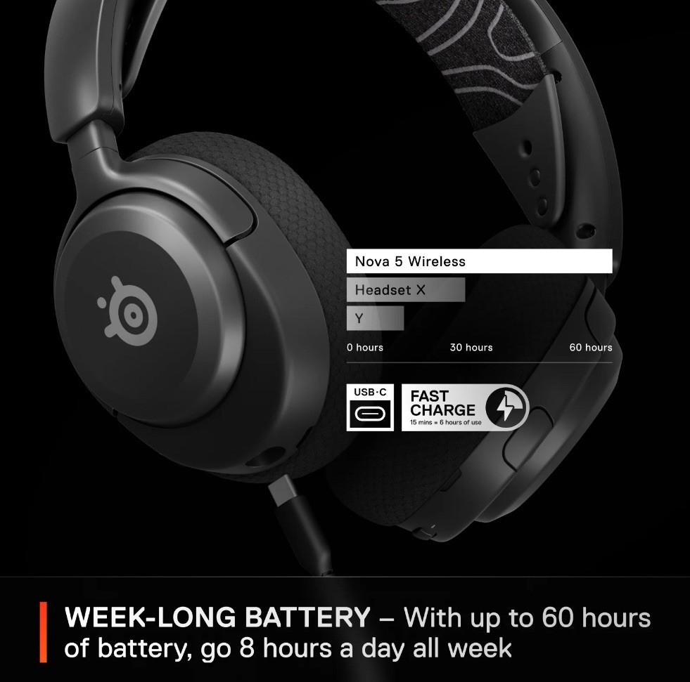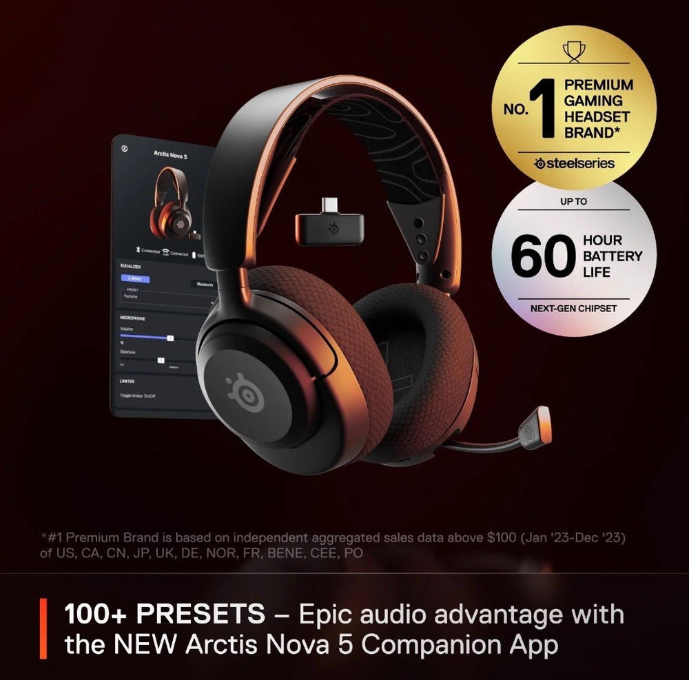 100+ GAME AUDIO PRESETS — Unlock tailored audio presets for top games like GTA V, FIFA, Call of Duty, and more, with the Arctis Nova 5 Companion App 60-HOUR BATTERY — Play longer than ever with the next-gen battery. Go 8 hours a day all week; plus with USB-C Fast Charge get 6 hours of use in just 15 minutes QUICK-SWITCH WIRELESS — Toggle between 2.4GHz gaming and Bluetooth 5.3 with a tap of a button to take a call or listen to media; notification beeps keep you posted on incoming calls while gaming HIGH-FIDELITY AUDIO — Forged from a rare-earth metal, the custom-designed Neodymium Magnetic Drivers create an ultra-detailed soundscape of clear highs, pinpoint mids, and deep bass NEXT-GEN MIC — Our upgraded, fully retractable ClearCast 2.X microphone has 2X the clarity with a high-bandwidth chipset supporting 32KHz/16Bit audio CROSS-PLATFORM — Easily swap between PC, PlayStation, Switch, Meta Quest, phones or tablets with a compact USB-C Dongle ON-EAR CONTROLS — All the buttons you need are right on the headset: Power, mute, volume adjustment, and Quick-Switch to tap into Bluetooth SteelSeries Arctis Nova 5 Wireless Multi-System Gaming Headset — Neodymium Magnetic Drivers — 100+ Audio Presets — 60 HR Battery — 2.4GHz or BT — ClearCast Gen2.X Mic — PC, PS5, PS4, Switch, Mobile