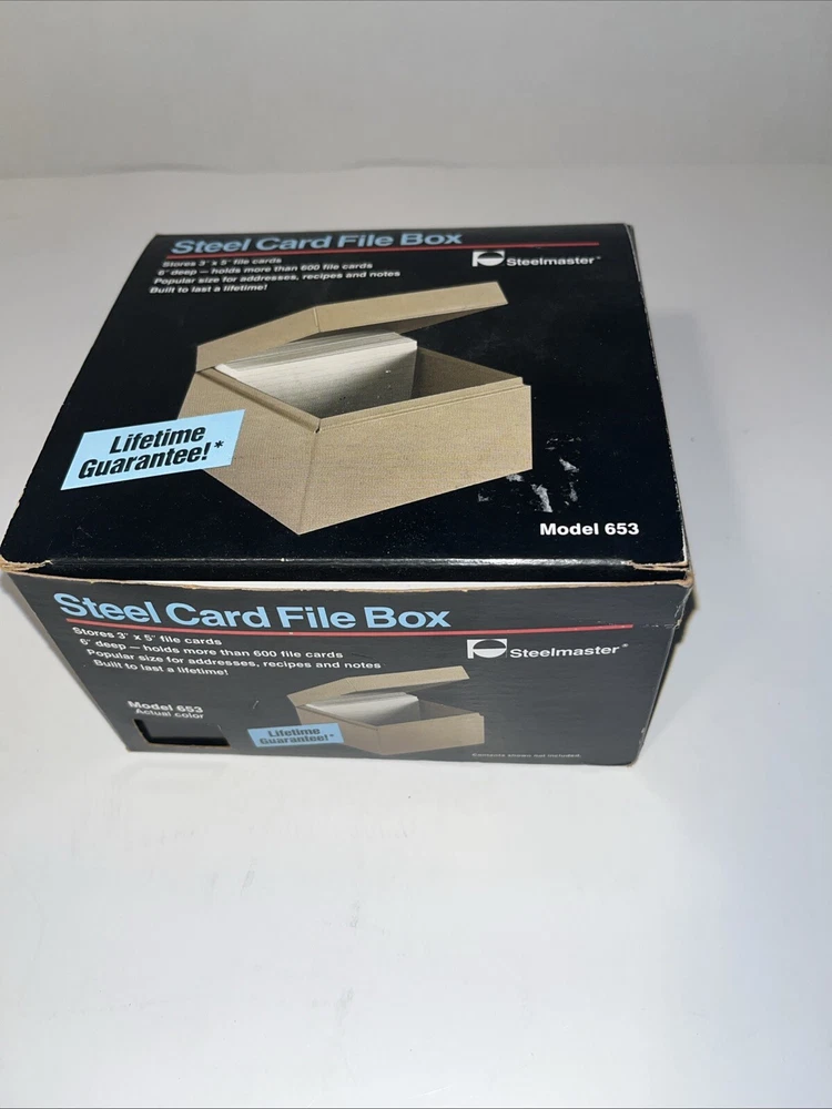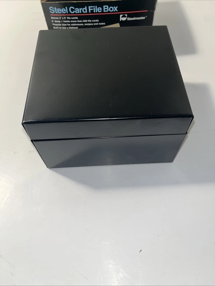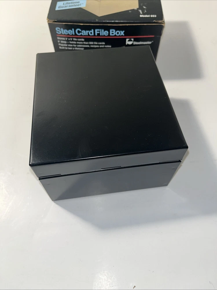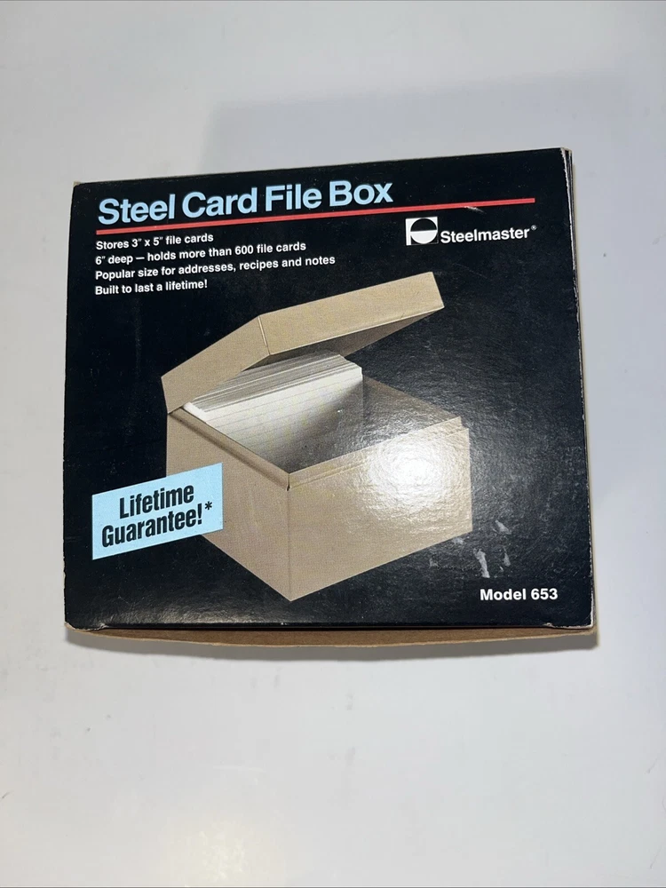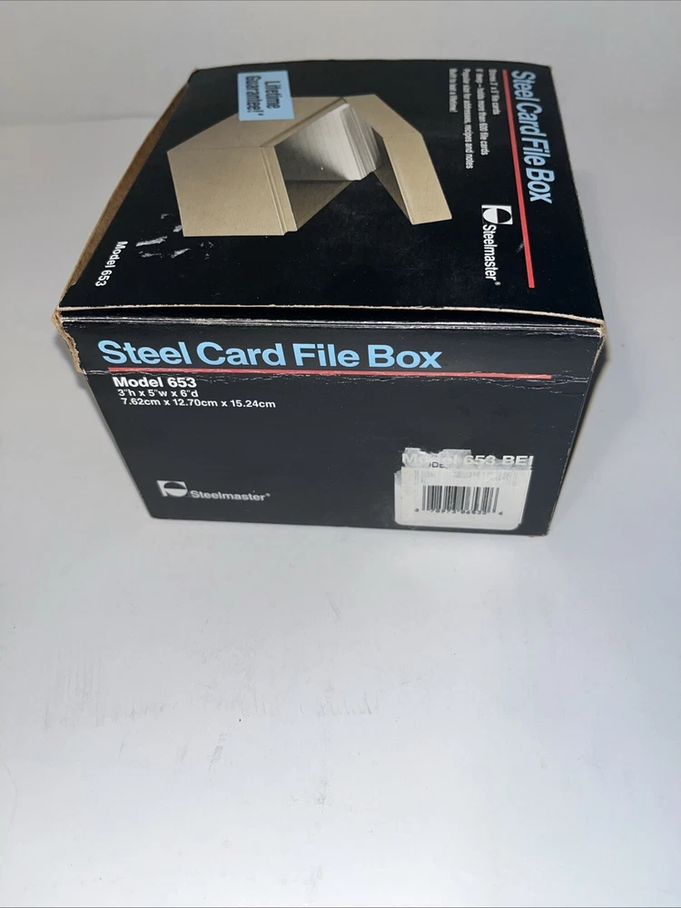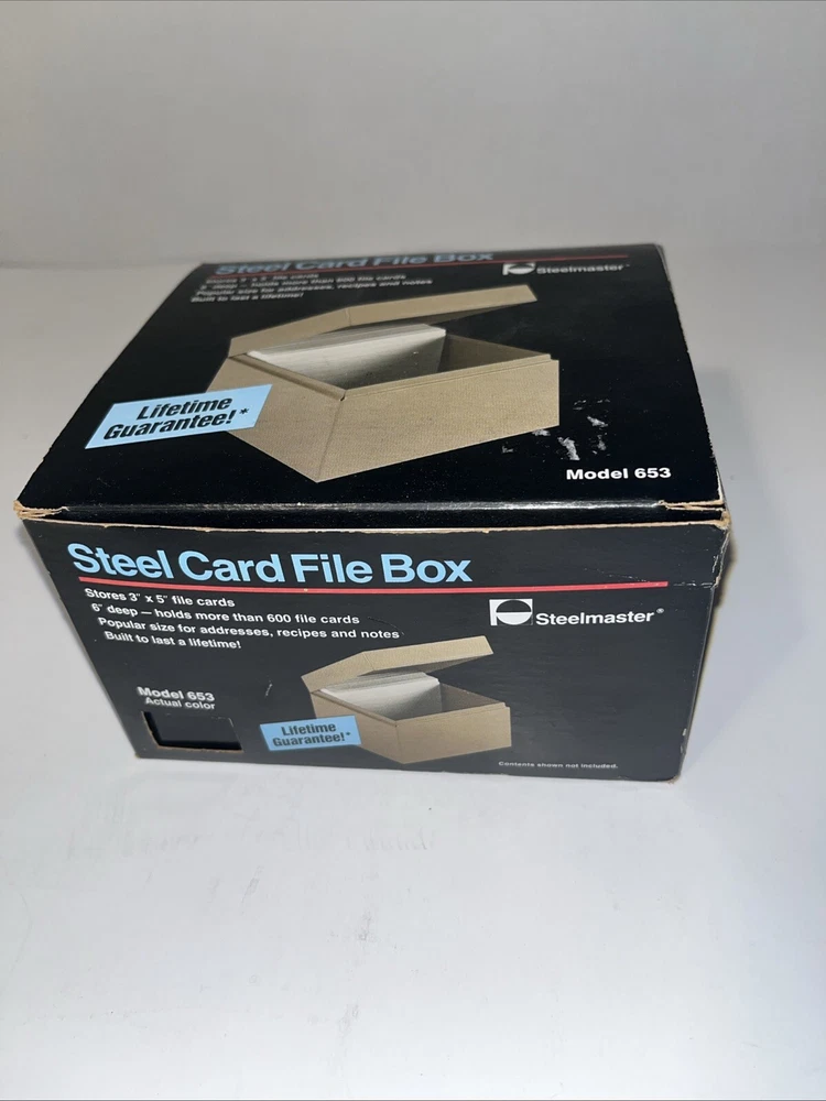 The Steelmaster Steel Card File Box Model 653 in Black is a sturdy and durable storage solution for organizing index cards or other small items. Made of steel, this card file box by Steelmaster is designed to keep your important documents or information secure and easily accessible. With its sleek black design, this new Steelmaster 653 card file box is perfect for use in homes, offices, or other professional settings where organization is key.