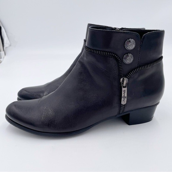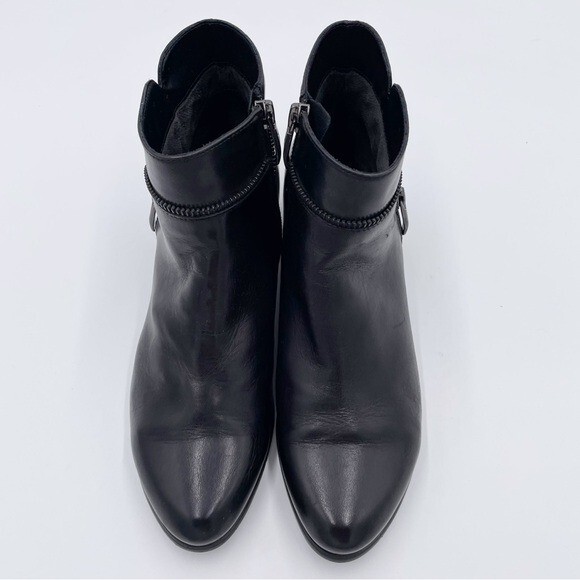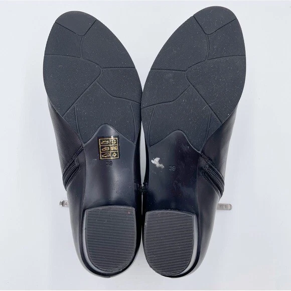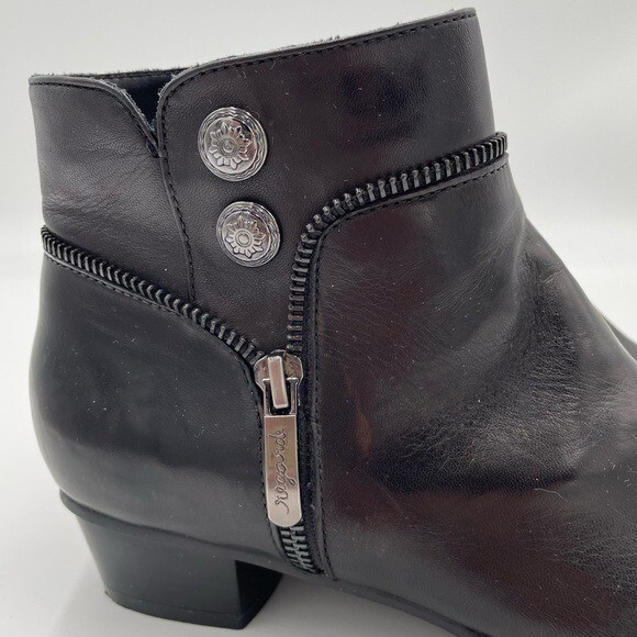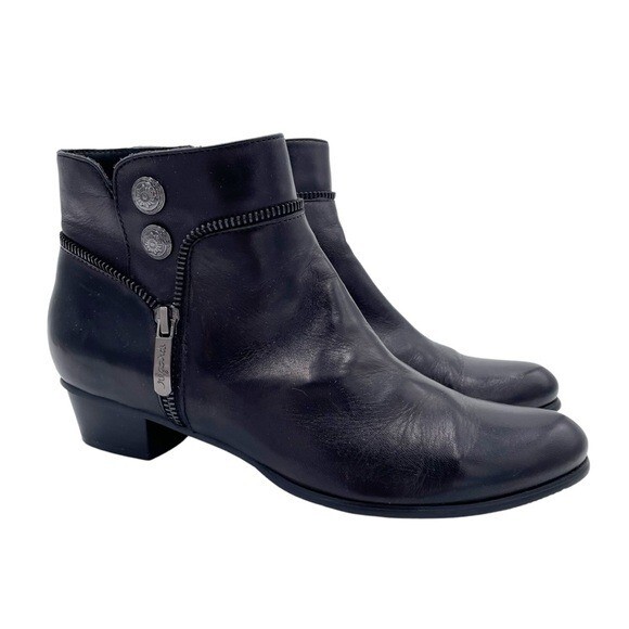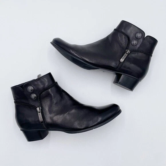 Regarde Le Ciel Stefany 277 Boot Black leather ankles boots with decorative zipper and stud details Inner zipper closure Small block heel measures approximately 1.5" high Size 39 Very good pre-owned condition Small area of discoloration on leather - see last photo for close up