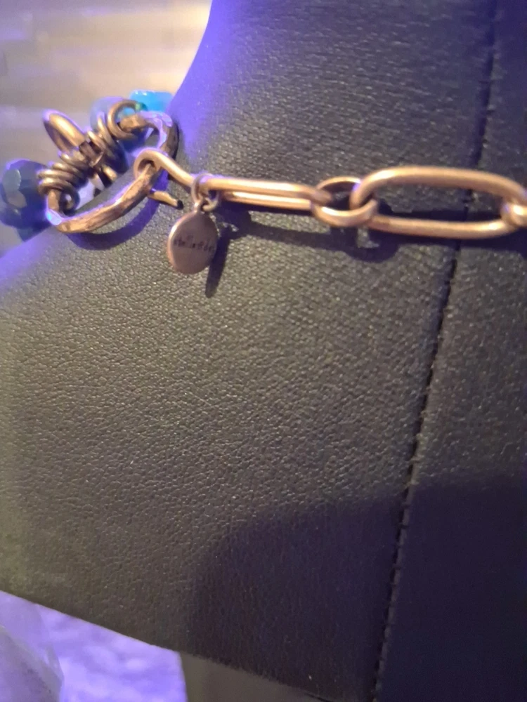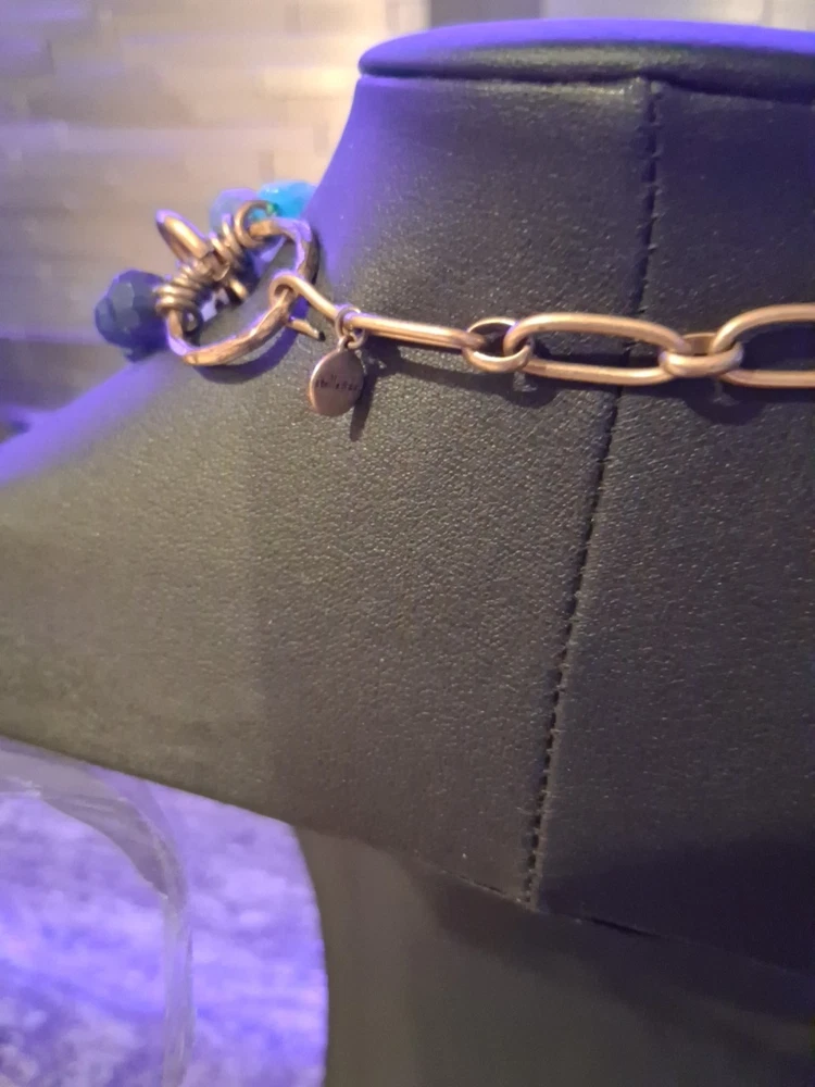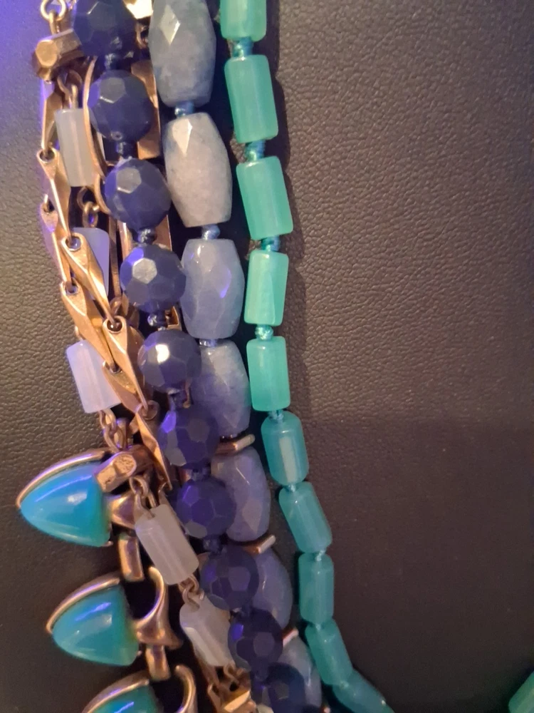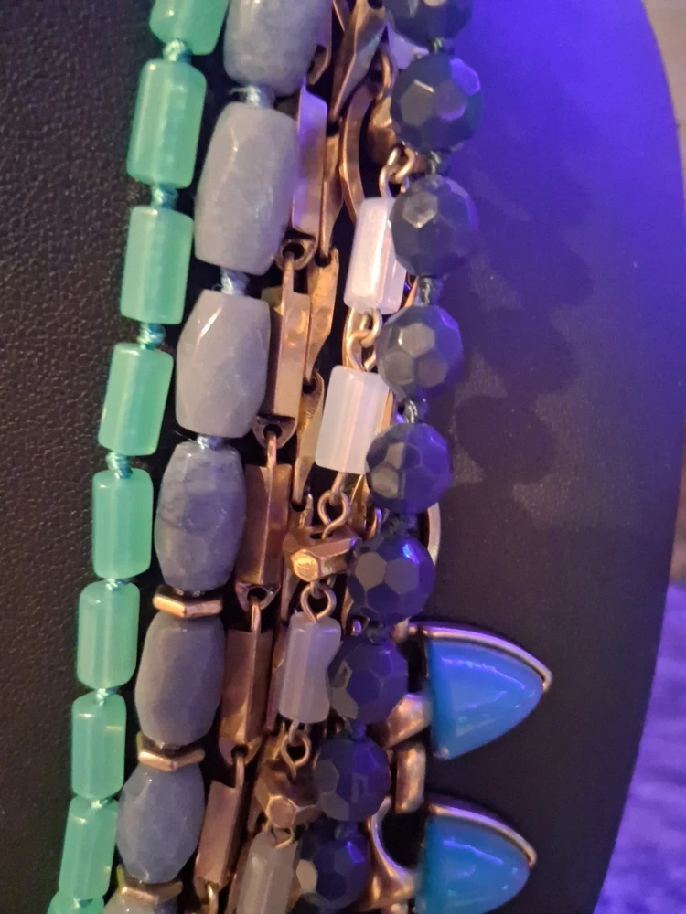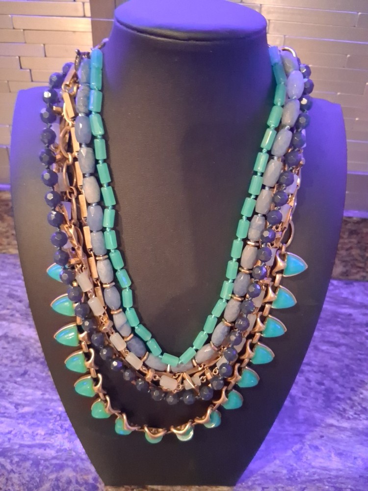 The Stella & Dot Green Blue Gold Sutton Stone Multilayer Statement Necklace is a stunning piece of jewelry featuring various pendant shapes with faceted Sodalite stones in a beautiful green color. The necklace is made of high-quality stone material with a gold metal alloy, making it a sophisticated and stylish accessory for women. The brand Stella & Dot is known for its unique and fashionable designs, making this necklace a perfect choice for those looking to add a touch of beauty to their outfit. Please see photos for exact condition. All offers considered.