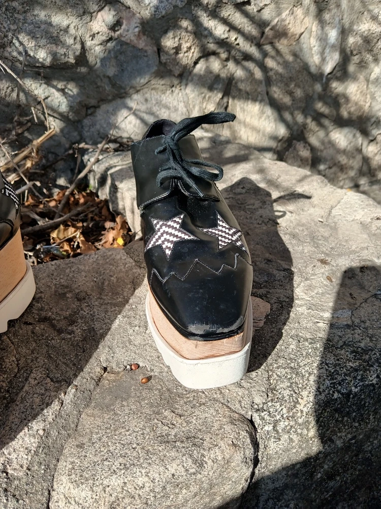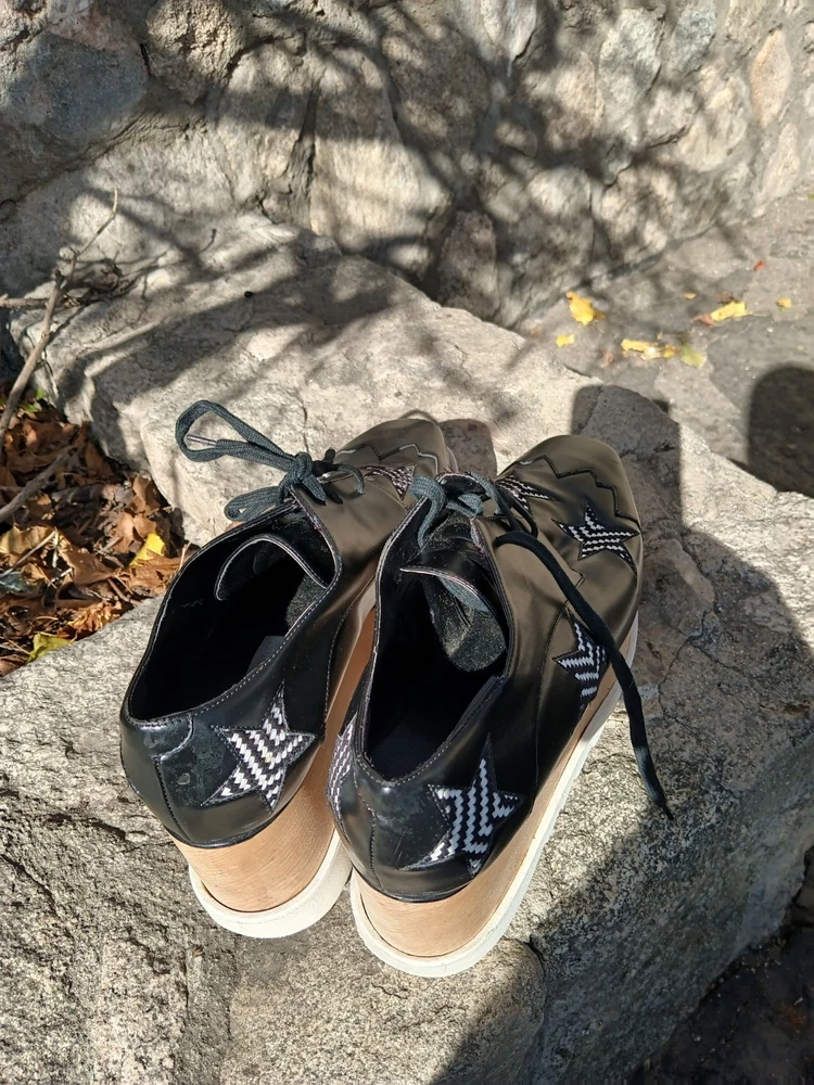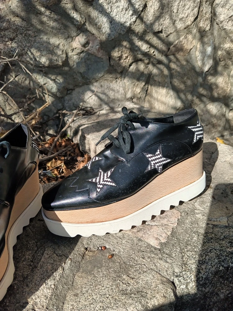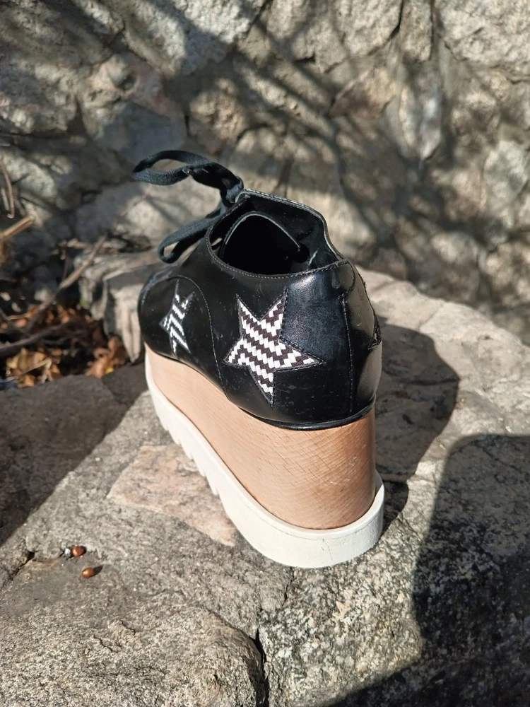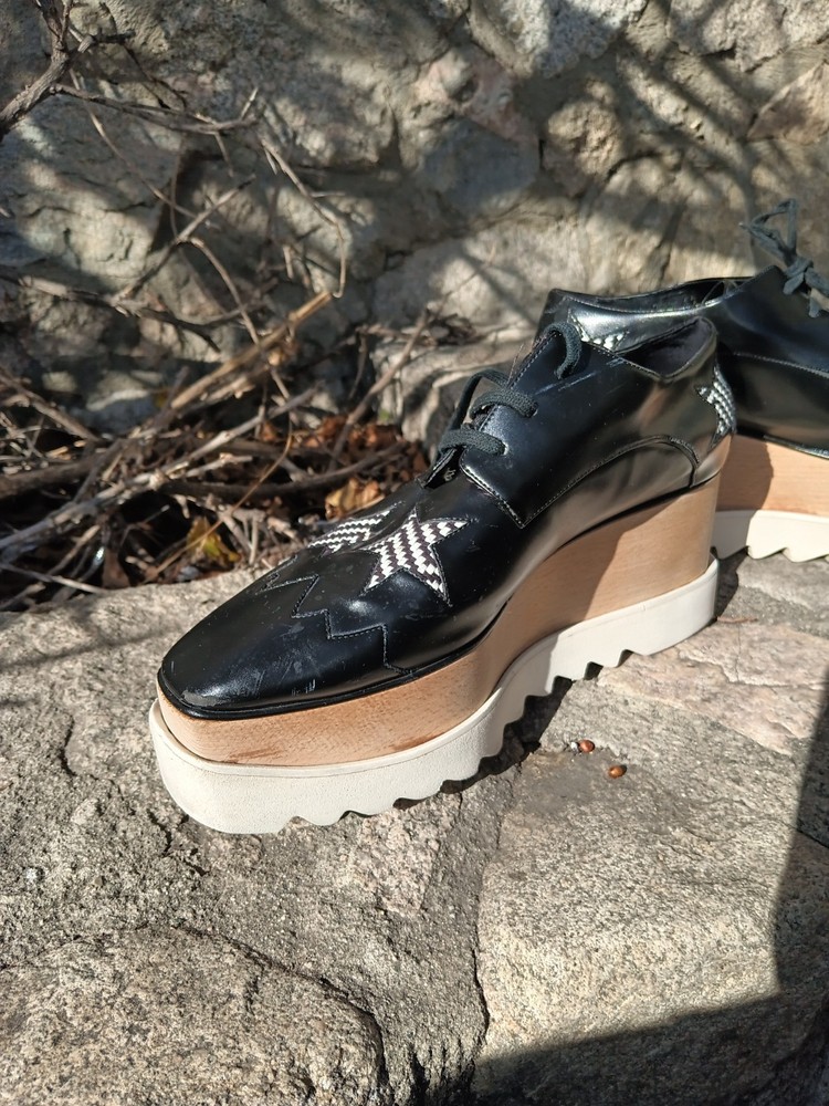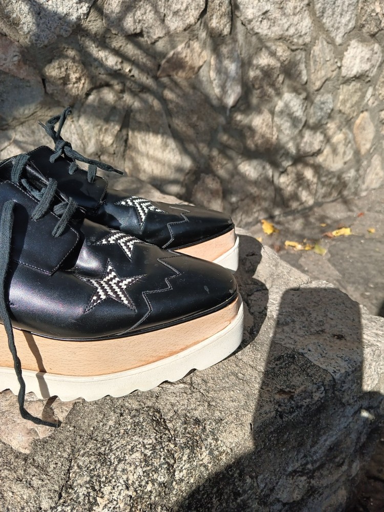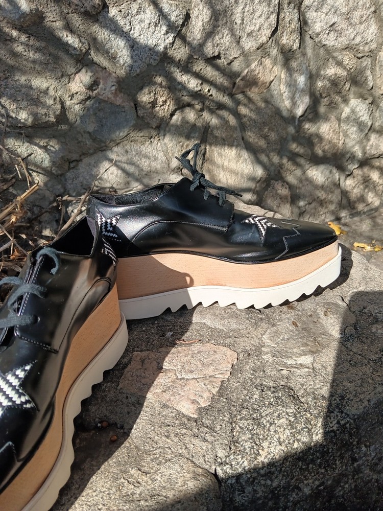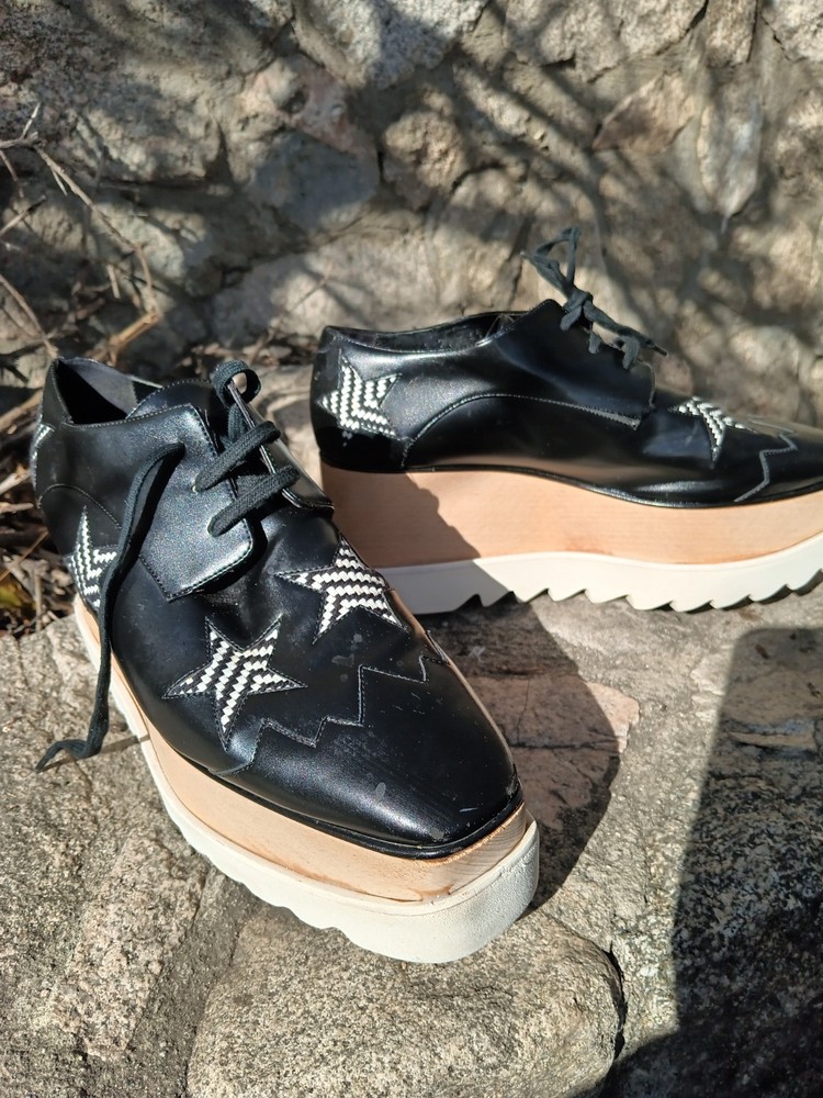 Authentic Stella McCartney Elyse platform oxfords featuring the iconic chunky stacked sole and bold star detailing. Black faux leather upper with contrast star appliqués and zig-zag stitching, finished with the signature wood-effect platform and white serrated rubber sole. A recognizable designer silhouette known for its eco-conscious construction. Statement lace-up oxford style that adds height with everyday wearability. Details: • Brand: Stella McCartney • Model: Elyse • Size: EU 40.5 / US Women’s 10.5 • Color: Black with white star accents • Style: Platform oxford / lace-up • Wood-effect stacked sole • White rubber saw-tooth outsole • Vegan / faux leather construction Condition: Pre-owned condition with visible wear consistent with use. Heel/sole shows uneven wear and is not perfectly level when placed on a flat surface, which may affect balance or feel when walking. Light scuffing and surface marks on uppers and platform, most noticeable at toes and edges. Please review photos carefully.