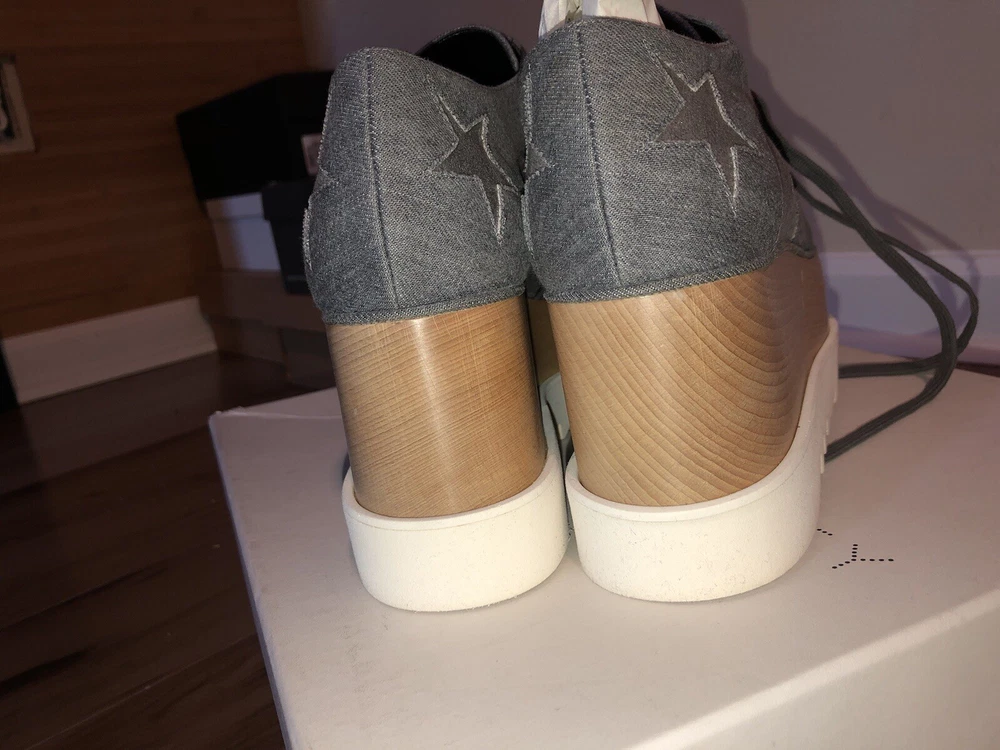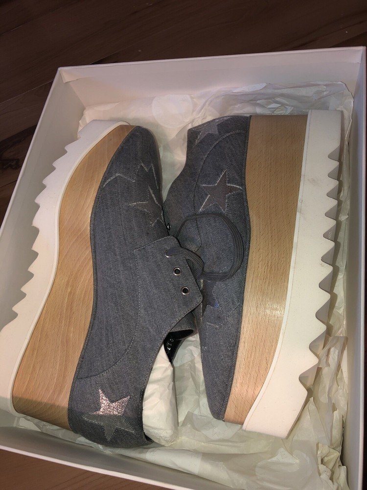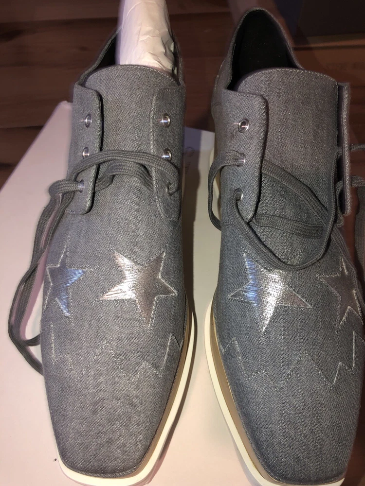 Elevate your style with these stunning size 41 Stella McCartney Light Blue Denim Fabric Elyse Stars Platform Lace Up sneakers. The almond toe shape and lace-up closure provide a comfortable fit, while the 3-inch platform height and high 3-3.9 inch heel height add a touch of glamour. The rubber outsole and standard shoe width ensure durability and comfort. These stylish sneakers are perfect for any occasion, from a casual day out to a night on the town. The stars theme adds a fun and unique touch to the design, making these shoes a must-have for any fashion-forward woman.