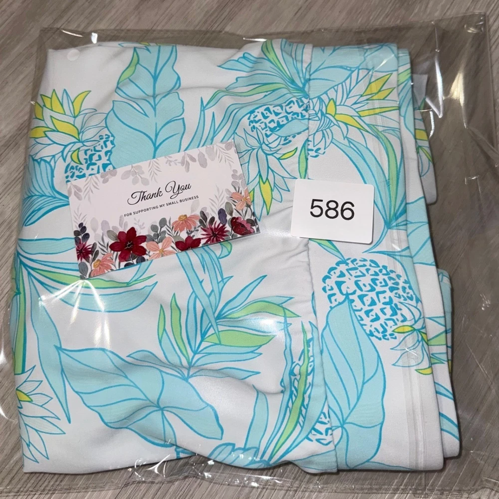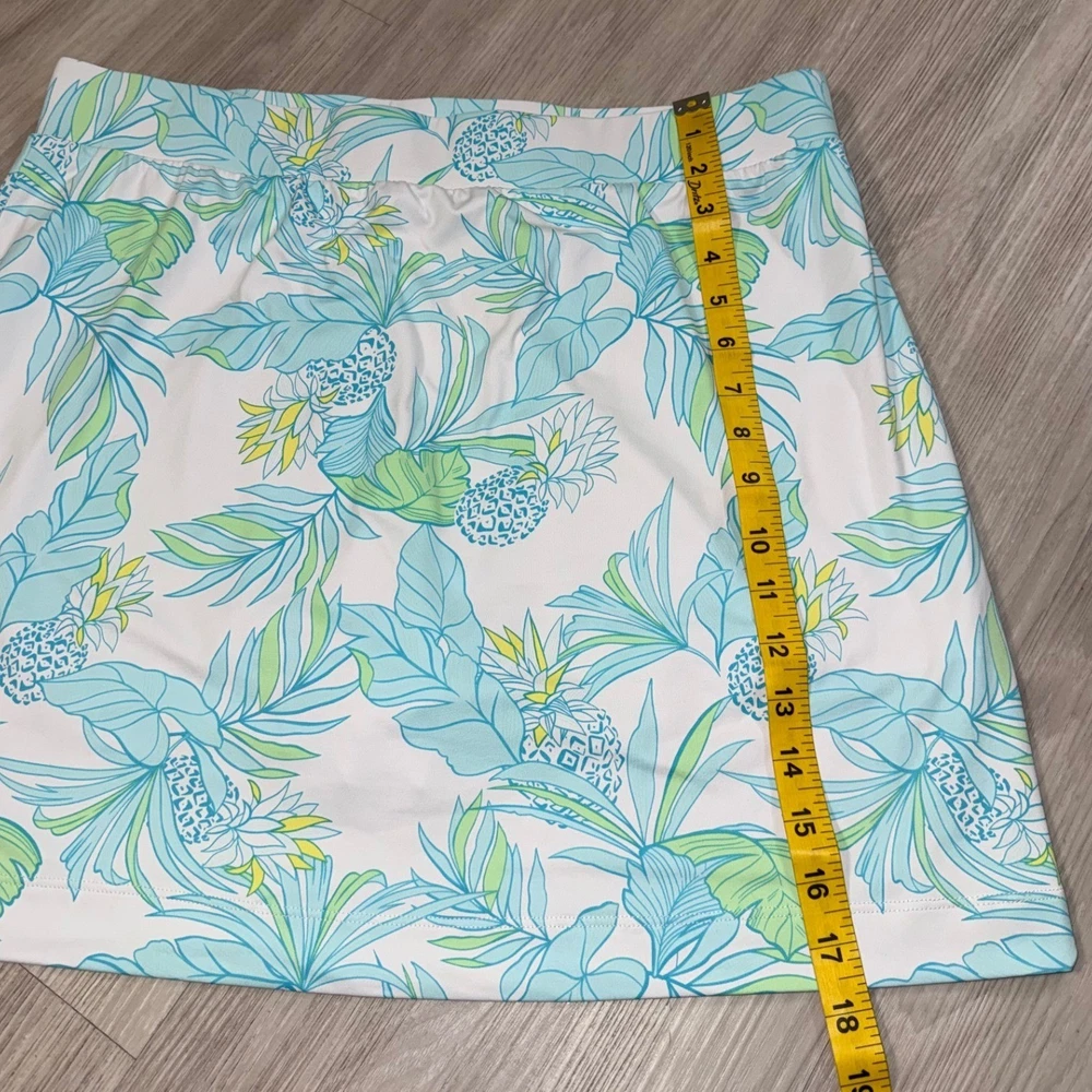 Beth Parker Collection active skort features a vibrant tropical pineapple and palm leaf print in shades of blue, green, and yellow on a crisp white background. Designed for performance and comfort, this pull-on style includes built-in white undershorts and a wide elastic waistband. The moisture-wicking nylon and spandex blend provides a flexible fit, making it an ideal choice for golf, tennis, or casual summer outings. Measurements: • Waist: 17" (34" doubled) • Length: 17" • Hem: 22" (44" doubled)
