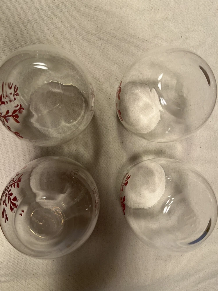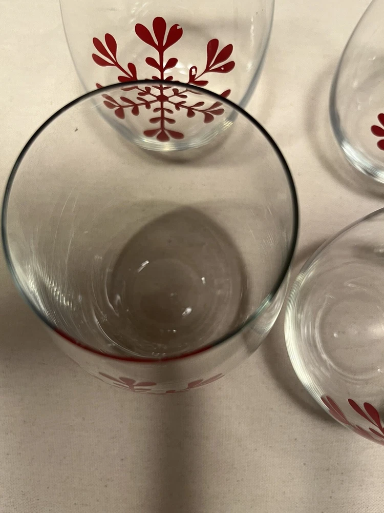 These cute wine glasses are perfect for the holidays. Please note snowflake on 2 glasses are slightly worn. Please see pics for accurate representation of condition. Stored in a smoke free, pet free home.