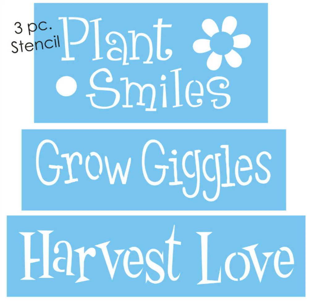 -(1) New Stencil Trio #T297 ~ Plant Smiles Grow Giggles Harvest Love with summer sunflower daisy Create beautiful DIY block signs with this 3-piece craft stencil set from Stencils by Joanie. The set features a charming shelf sitter Block design that will brighten up any home or craft project. Made from durable 7 mil blue mylar material, these stencils are perfect for decorative tole painting and other crafting projects. Crafted in the United States, the Garden theme, Plant Smiles Grow Giggle design are perfect for adding a touch of warmth and cheer to your space. Get creative with this versatile stencil set and let your imagination run wild! Inspire the artist in you with Stencils by Joanie Your purchase includes free shipping from Joanie