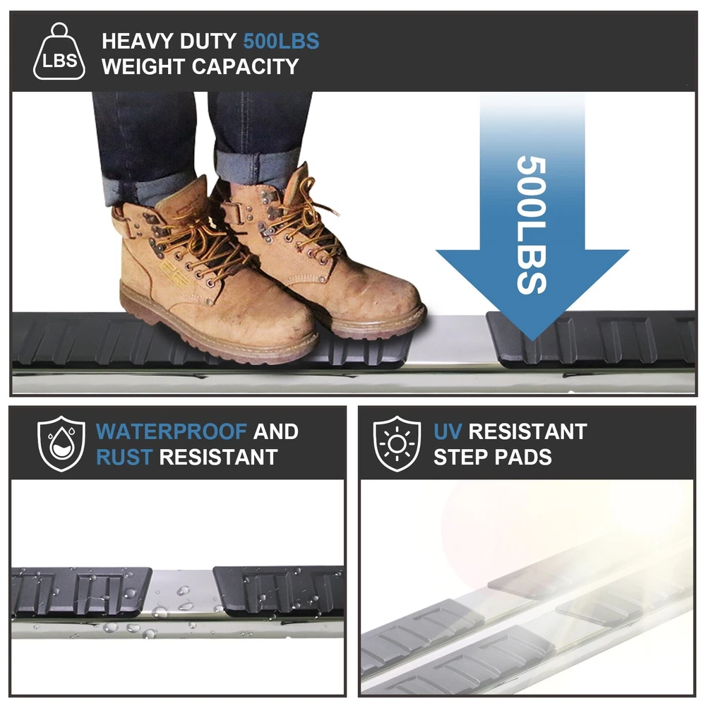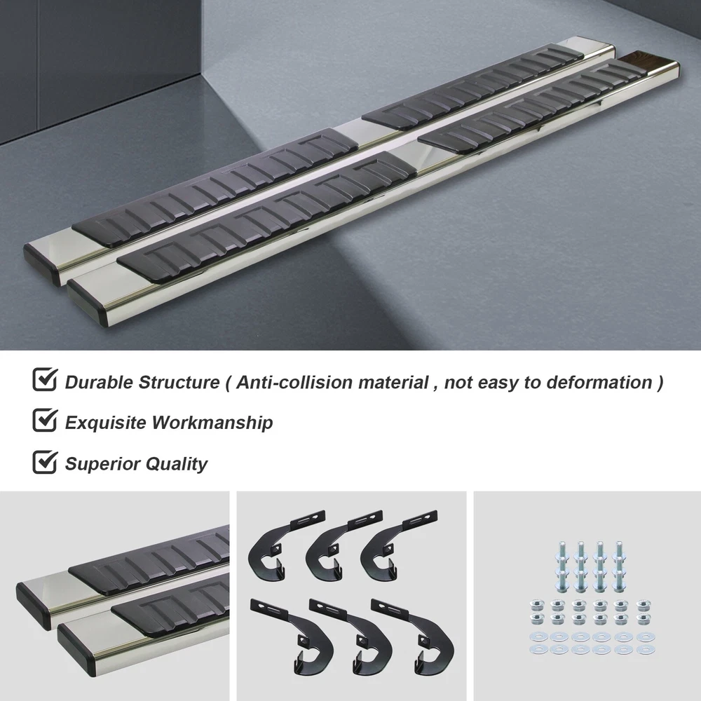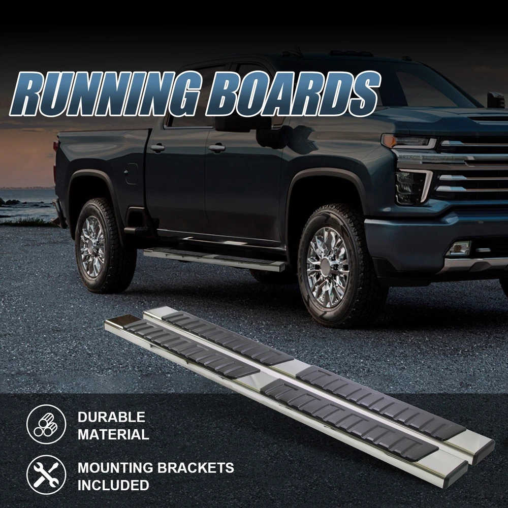 Specification Material: Stainless Steel, ABS Only Fit: Crew Cab Item Weight(lbs): 48.06 Package Dimensions(LengthxWidthxHeight:inch): 85.43x8.66x8.66 Package Weight(lbs): 50.27 Condition: New Style: OE Style Installation Instruction: Not Included Placement on Vehicle: Left+Right Vehicle Service Type: Truck Fitment Type: Direct Replacement Color: Black, Silver Package Include: 1x Pair of Running Boards (Left + Right) Brackets on Each Side Mounting Hardware Sealing End Cover: Yes Manufacturer Warranty: 1 Year Tread(inch):6" Fitment 2019- 2023 Chevrolet Silverado 1500 2022- 2023 Chevrolet Silverado 1500 LTD 2020- 2023 Chevrolet Silverado 2500 HD 2020- 2023 Chevrolet Silverado 3500 HD 2019-2023 GMC Sierra 1500 2022- 2023 GMC Sierra 1500 Limited 2020-2023 GMC Sierra 2500 HD 2020-2023 GMC Sierra 3500 HD Description 1. Made with durable, heavy-duty high light stainless steel and ABS plastic. Seamless joined ABS plastic tread with powder coated body surface to achieve great UV rays, rust, and slippery resistance. 2. Our running boards are made from the finest aluminum alloy, which is sturdy, durable, wear-resistant and rust-resistant. After repeated tests, they can resist the corrosion of salt spray, and withstand UV radiation without discoloration. 3. To a certain extent, they also help protect the paint on the side of the car from being scratched. At the same time, you can easily reach the top of your car when you need it, such as accessing the luggage rack or cleaning the rooftop. 4. Slider Design, Able to adjust position on vehicle forward & backwards for better customization. the whole closed end design make your running board inside clean. 5. Whatever finish you choose, the result is a smooth, finished look that complements your factory chrome and trim perfectly. 6. Running Boards & Side Steps make your life safe and simple for taking your coworkers to the job place, take your pets go out or carpooling the kids to school both. You have a very solid under foot feeling thanks to the Anti-slip tread surface and rugged construction. 7. Easy bolt-on installation: No cutting or drilling. On Nov 18, 2024 at 03:01:10 PST, seller added the following information: On Nov 22, 2024 at 01:59:20 PST, seller added the following information: