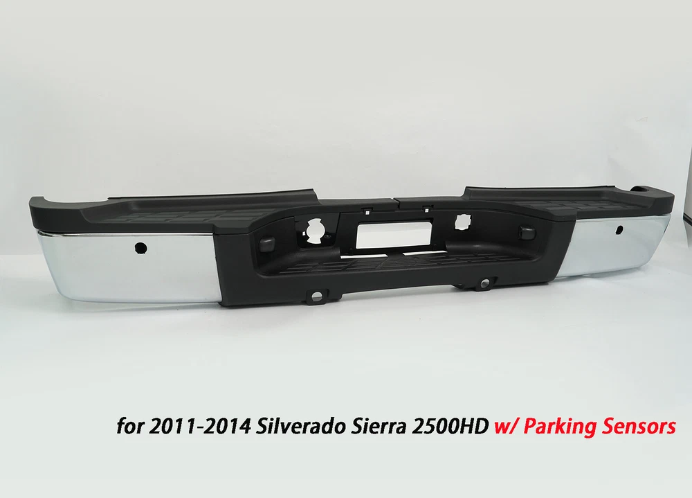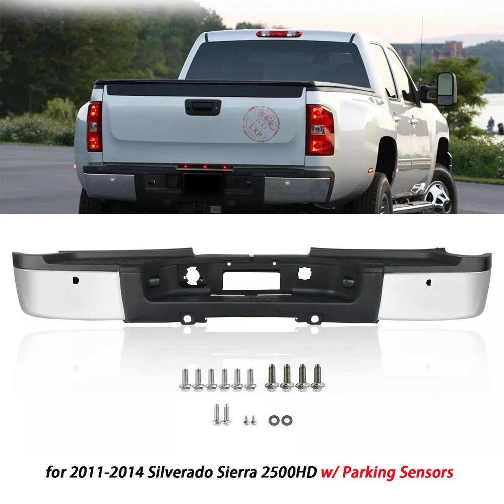 Fitment: For 2011-2014 Chevrolet Silverado 2500 HD 3500 HD For 2011-2014 GMC Sierra 2500 HD 3500 HD For Models With Park Assist Sensors Details Placement on Vehicle:Rear Color:Chrome Material:Steel Package Includes: 1*Rear Bumper Assembly