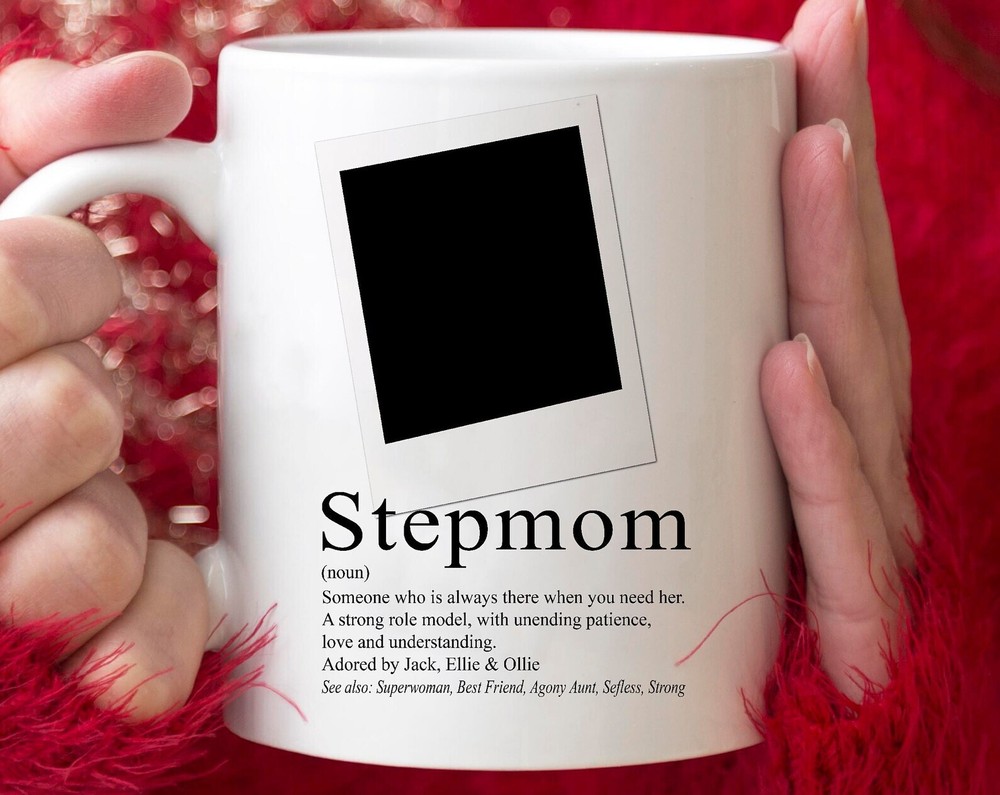 Stepmom Definition Mug Personalized Mug Mother's Day Gift Gift For Bonus Mom Product Details.. This high quality 11oz. ceramic white mug has a premium hard coat that provides crisp and vibrant color reproduction sure to last for years. Perfect for all hot & cold beverages. The highest quality printing possible is used. It will never fade no matter how many times you wash it. Material: 100% Ceramic. Print both sides. Dishwasher and Microwave Safe. High Gloss + Premium White Finish. Printed in the U.S.A. Personalized & Custom. We support personalized and custom mug to add custom, when placing an order, you can add notes to the "order note" in shipping address section. Also you can contact us directly via message. Shipping Info. Ready to ship in 1 to 2 business days, All products are made-to-order and proudly printed in the United States. Shipped by USPS and DHL, You will receive your order in 5-7 days. Replace & Refund. All products are defective during shipping broken, chipped will be replaced free of charge. You are not satisfied with the product, we will refund 100% money to you. If any other issues arise, please do not hesitate to message, we would be more than happy to assist you.